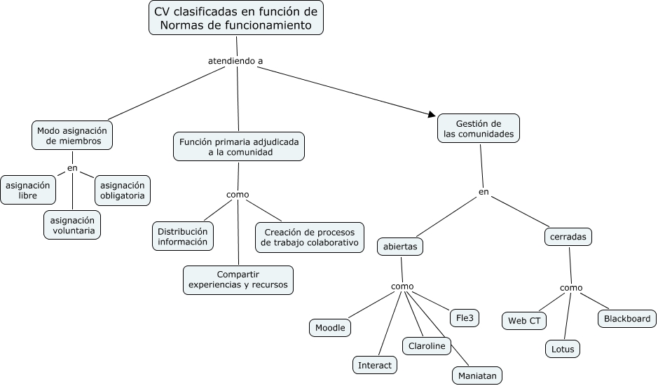 Este Cmap, tiene información relacionada con: Tipo normas, Función primaria adjudicada a la comunidad como Compartir experiencias y recursos, Modo asignación de miembros en asignación libre, abiertas como Interact, Modo asignación de miembros en asignación obligatoria, CV clasificadas en función de Normas de funcionamiento atendiendo a Gestión de las comunidades, Función primaria adjudicada a la comunidad como Distribución información, abiertas como Claroline, cerradas como Web CT, cerradas como Lotus, Función primaria adjudicada a la comunidad como Creación de procesos de trabajo colaborativo, Gestión de las comunidades en cerradas, abiertas como Maniatan, CV clasificadas en función de Normas de funcionamiento atendiendo a Modo asignación de miembros, CV clasificadas en función de Normas de funcionamiento atendiendo a Función primaria adjudicada a la comunidad, abiertas como Fle3, Modo asignación de miembros en asignación voluntaria, Gestión de las comunidades en abiertas, abiertas como Moodle, cerradas como Blackboard