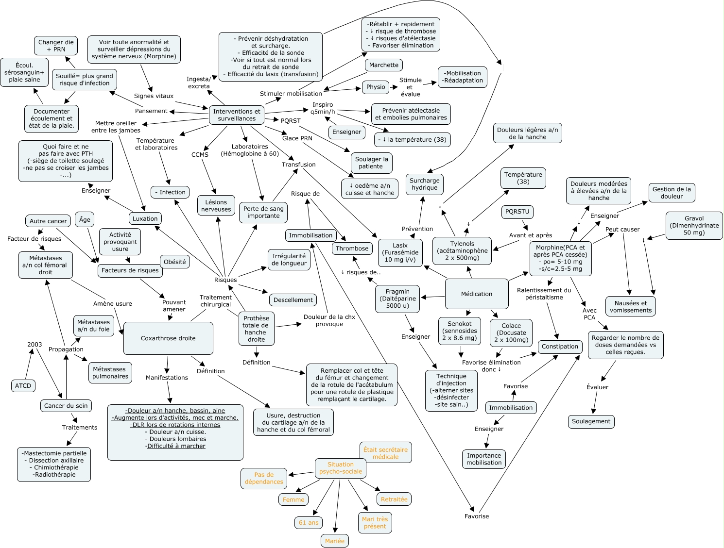 Cette carte conceptuelle, cree avec IHMC CmapTools, contient des informations liees a : stage 2.2, Activité provoquant usure Facteurs de risques, Marchette Stimuler mobilisation -Rétablir + rapidement - ↓ risque de thrombose - ↓ risques d'atélectasie - Favoriser élimination, Interventions et surveillances Mettre oreiller entre les jambes Luxation, Situation psycho-sociale Retraitée, Médication Senokot (sennosides 2 x 8.6 mg), Médication Tylenols (acétaminophène 2 x 500mg), Luxation Enseigner Quoi faire et ne pas faire avec PTH (-siège de toilette soulegé -ne pas se croiser les jambes -...), Prothèse totale de hanche droite Risques Descellement, Situation psycho-sociale Femme, Prothèse totale de hanche droite Risques Perte de sang importante, Interventions et surveillances Température et laboratoires - Infection, Fragmin (Daltéparine 5000 u) Enseigner Technique d'injection (-alterner sites -désinfecter -site sain..), Coxarthrose droite Traitement chirurgical Prothèse totale de hanche droite, PQRSTU Avant et après Tylenols (acétaminophène 2 x 500mg), Médication Fragmin (Daltéparine 5000 u), Cancer du sein Propagation Métastases pulmonaires, Interventions et surveillances Pansement Souillé= plus grand risque d'infection, Situation psycho-sociale Était secrétaire médicale, PQRSTU Avant et après Morphine(PCA et après PCA cessée) - po= 5-10 mg -s/c=2.5-5 mg, Interventions et surveillances PQRST Soulager la patiente