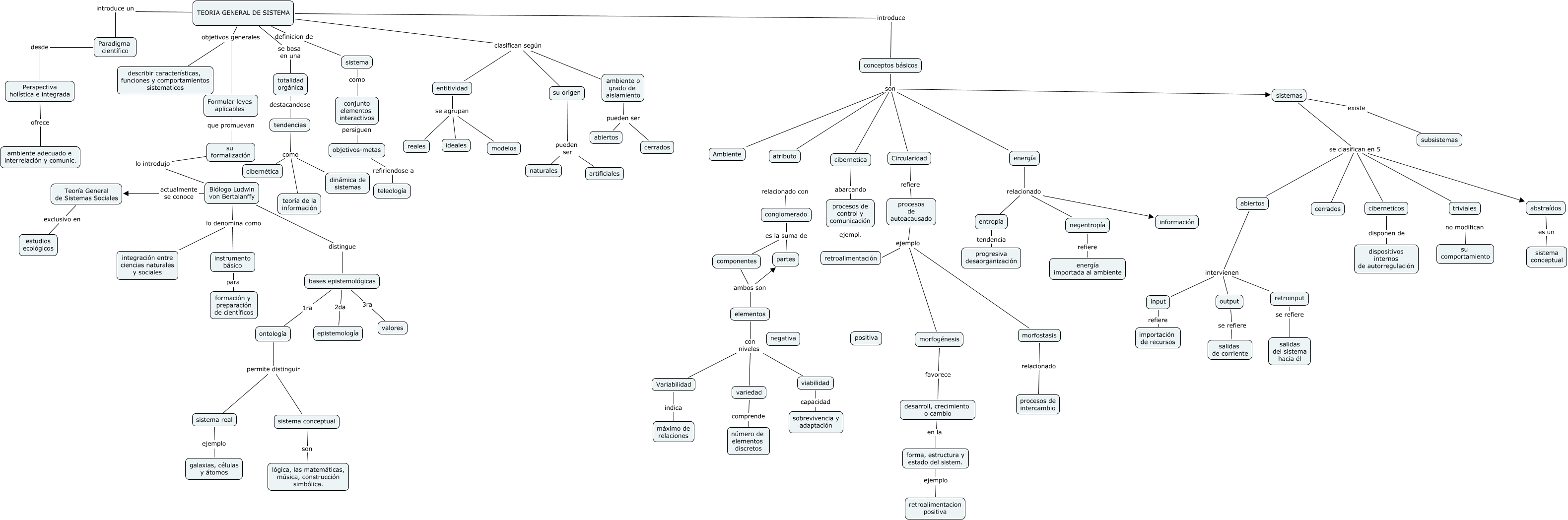 Este Cmap, tiene información relacionada con: tgs, TEORIA GENERAL DE SISTEMA objetivos generales Formular leyes aplicables, tendencias como dinámica de sistemas, viabilidad capacidad sobrevivencia y adaptación, abiertos intervienen output, TEORIA GENERAL DE SISTEMA clasifican según entitividad, triviales no modifican su comportamiento, sistemas se clasifican en 5 triviales, desarroll, crecimiento o cambio en la forma, estructura y estado del sistem., conglomerado es la suma de partes, cibernetica abarcando procesos de control y comunicación, conceptos básicos son atributo, morfogénesis favorece desarroll, crecimiento o cambio, sistemas se clasifican en 5 cerrados, ambiente o grado de aislamiento pueden ser cerrados, TEORIA GENERAL DE SISTEMA clasifican según su origen, Paradigma científico desde Perspectiva holística e integrada, morfostasis relacionado procesos de intercambio, energía relacionado información, elementos con niveles variedad, TEORIA GENERAL DE SISTEMA definicion de sistema
