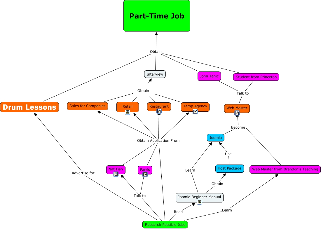 This Concept Map, created with IHMC CmapTools, has information related to: Part-Time Job October 10, 2009, Nat Fish Obtain Application From Temp Agency, Web Master Talk to Student from Princeton, Nat Fish Obtain Application From Sales for Companies, Drum Lessons Obtain Part-Time Job, Farris Obtain Application From Sales for Companies, Research Possible Jobs Talk to Nat Fish, Host Package Use Joomla, Research Possible Jobs Obtain Application From Temp Agency, Research Possible Jobs Read Joomla Beginner Manual, Research Possible Jobs Obtain Application From Sales for Companies, Joomla Beginner Manual Obtain Host Package, Web Master Talk to John Tanic, Research Possible Jobs Obtain Application From Restaurant, Nat Fish Obtain Application From Retail, Temp Agency Obtain Interview, Farris Obtain Application From Restaurant, Sales for Companies Obtain Interview, Research Possible Jobs Learn Web Master from Brandon's Teaching, Farris Obtain Application From Temp Agency, Farris Obtain Application From Retail
