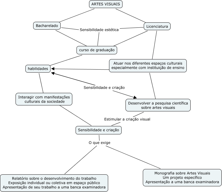 Esse mapa conceitual, produzido no IHMC CmapTools, tem a informação relacionada a: Artes Visuais, curso de graduação ???? habilidades, Bacharelado Sensibilidade estética curso de graduação, habilidades Sensibilidade e criação Desenvolver a pesquisa científica sobre artes visuais, ARTES VISUAIS ???? Licenciatura, Atuar nos diferentes espaços culturais especialmente com instituição de ensino ???? Desenvolver a pesquisa científica sobre artes visuais, Sensibilidade e criação O que exige Relatório sobre o desenvolvimento do trabalho Exposição individual ou coletiva em espaço público Apresentação de seu trabalho a uma banca examinadora, Atuar nos diferentes espaços culturais especialmente com instituição de ensino ???? habilidades, Desenvolver a pesquisa científica sobre artes visuais Estimular a criação visual Sensibilidade e criação, habilidades ???? Sensibilidade e criação, Licenciatura ???? Atuar nos diferentes espaços culturais especialmente com instituição de ensino, Licenciatura ???? curso de graduação, ARTES VISUAIS ???? Bacharelado, Bacharelado ???? curso de graduação, Licenciatura Sensibilidade estética curso de graduação, Sensibilidade e criação O que exige Monografia sobre Artes Visuais Um projeto específico Apresentação a uma banca examinadora, habilidades ???? Interagir com manifestações culturais da sociedade