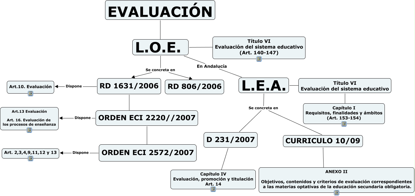 This Concept Map, created with IHMC CmapTools, has information related to: Evaluación, L.O.E. Se concreta en RD 806/2006, L.O.E. En Andalucía L.E.A., L.E.A. Se concreta en CURRICULO 10/09, D 231/2007 ???? Capítulo IV Evaluación, promoción y titulación Art. 14, L.E.A. ???? Título VI Evaluación del sistema educativo, L.O.E. ???? Título VI Evaluación del sistema educativo (Art. 140-147), ORDEN ECI 2220//2007 ???? ORDEN ECI 2572/2007, EVALUACIÓN ???? L.O.E., ORDEN ECI 2572/2007 Dispone Art. 2,3,4,9,11,12 y 13, Título VI Evaluación del sistema educativo ???? Capítulo I Requisitos, finalidades y ámbitos (Art. 153-154), CURRICULO 10/09 ???? ANEXO II Objetivos, contenidos y criterios de evaluación correspondientes a las materias optativas de la educación secundaria obligatoria., L.E.A. Se concreta en D 231/2007, L.O.E. Se concreta en RD 1631/2006, ORDEN ECI 2220//2007 Dispone Art.13 Evaluación Art. 16. Evaluación de los procesos de enseñanza, RD 1631/2006 Dispone Art.10. Evaluación, RD 1631/2006 ???? ORDEN ECI 2220//2007