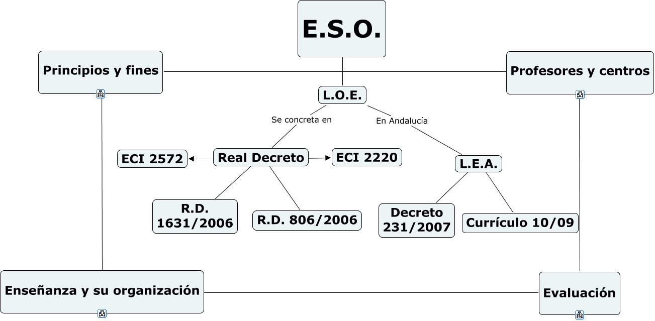 This Concept Map, created with IHMC CmapTools, has information related to: Esquema principal, E.S.O. ???? L.O.E., Evaluación ???? Enseñanza y su organización, L.O.E. En Andalucía L.E.A., Real Decreto ???? ECI 2220, L.O.E. Se concreta en Real Decreto, Real Decreto ???? R.D. 806/2006, Real Decreto ???? ECI 2572, Profesores y centros ???? Evaluación, L.E.A. ???? Currículo 10/09, L.E.A. ???? Decreto 231/2007, Real Decreto ???? R.D. 1631/2006, Principios y fines ???? Profesores y centros, Enseñanza y su organización ???? Principios y fines