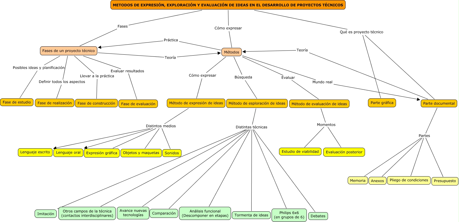 Este Cmap, tiene información relacionada con: FERAL1, Métodos Mundo real Parte documental, Método de esploración de ideas Distintas técnicas Otros campos de la técnica (contactos interdisciplinares), Método de esploración de ideas Distintas técnicas Tormenta de ideas, Parte documental Partes Pliego de condiciones, Método de expresión de ideas Distintos medios Lenguaje escrito, Parte documental Teoría Métodos, Métodos Práctica Fases de un proyecto técnico, Método de esploración de ideas Distintas técnicas Análisis funcional (Descomponer en etapas), Parte documental Partes Memoria, Método de esploración de ideas Distintas técnicas Avance nuevas tecnologías, METODOS DE EXPRESIÓN, EXPLORACIÓN Y EVALUACIÓN DE IDEAS EN EL DESARROLLO DE PROYECTOS TÉCNICOS Qué es proyecto técnico Parte gráfica, Método de expresión de ideas Distintos medios Lenguaje oral, Método de expresión de ideas Distintos medios Objetos y maquetas, Método de expresión de ideas Distintos medios Expresión gráfica, Método de esploración de ideas Distintas técnicas Comparación, Parte documental Partes Anexos, Fases de un proyecto técnico Llevar a la práctica Fase de construcción, METODOS DE EXPRESIÓN, EXPLORACIÓN Y EVALUACIÓN DE IDEAS EN EL DESARROLLO DE PROYECTOS TÉCNICOS Qué es proyecto técnico Parte documental, Parte documental Partes Presupuesto, Fases de un proyecto técnico Definir todos los aspectos Fase de realización