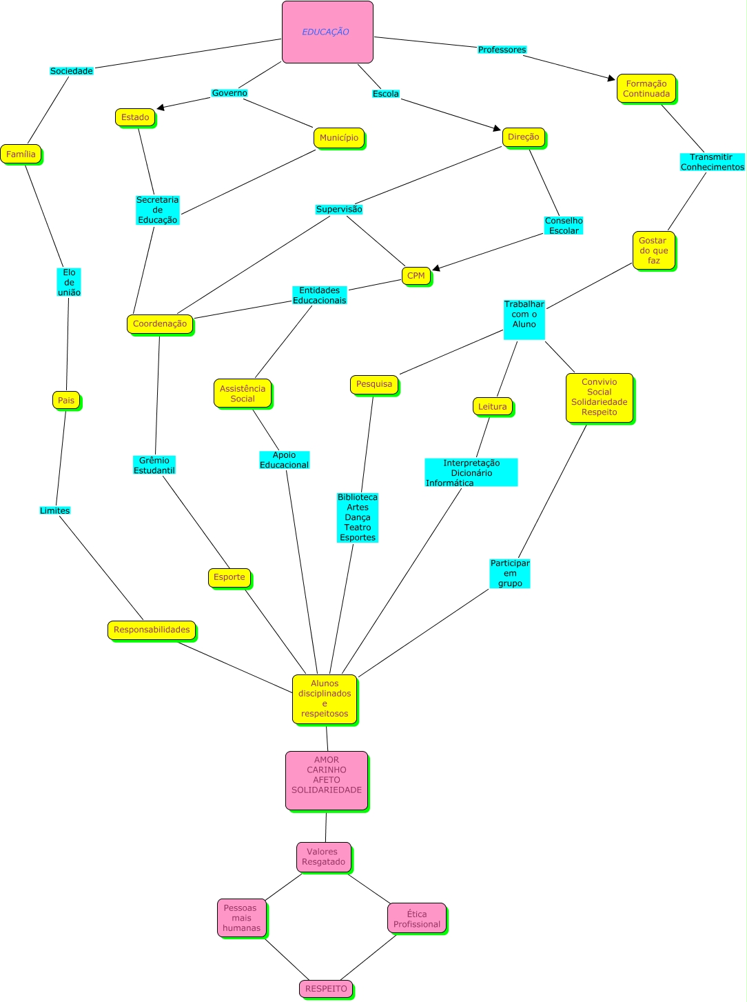Esse mapa conceitual, produzido no IHMC CmapTools, tem a informação relacionada a: Mapa conceitual - Educação.cmap jussara, Gostar do que faz Trabalhar com o Aluno Pesquisa, AMOR CARINHO AFETO SOLIDARIEDADE ???? Valores Resgatado, Alunos disciplinados e respeitosos ???? AMOR CARINHO AFETO SOLIDARIEDADE, EDUCAÇÃO Sociedade Família, EDUCAÇÃO Escola Direção, Ética Profissional ???? RESPEITO, Leitura Interpretação Dicionário Informática Alunos disciplinados e respeitosos, Convivio Social Solidariedade Respeito Participar em grupo Alunos disciplinados e respeitosos, Pesquisa Biblioteca Artes Dança Teatro Esportes Alunos disciplinados e respeitosos, Família Elo de união Pais, CPM Entidades Educacionais Assistência Social, Município Secretaria de Educação Coordenação, Estado Secretaria de Educação Coordenação, EDUCAÇÃO Governo Município, Direção Conselho Escolar CPM, Direção Supervisão Coordenação, Gostar do que faz Trabalhar com o Aluno Leitura, EDUCAÇÃO Governo Estado, Direção Supervisão CPM, Gostar do que faz Trabalhar com o Aluno Convivio Social Solidariedade Respeito