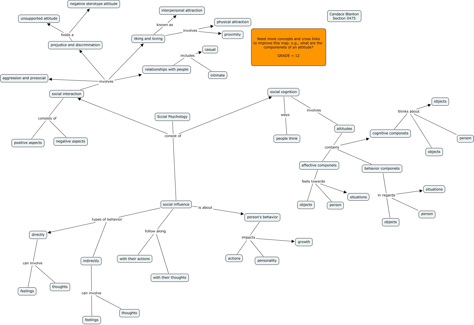 Candace Blanton Ch. 12, behavior componets in regards person, attitudes contains behavior componets, indirectly can involve feelings, prejudice and discrimination holds a unsupported attitude, social interaction involves aggression and prosocial, social cognition involves attitudes, indirectly can involve thoughts, cognitive componets thinks about person, Sccial Psychology consist of social influence, social influence follow along with their thoughts