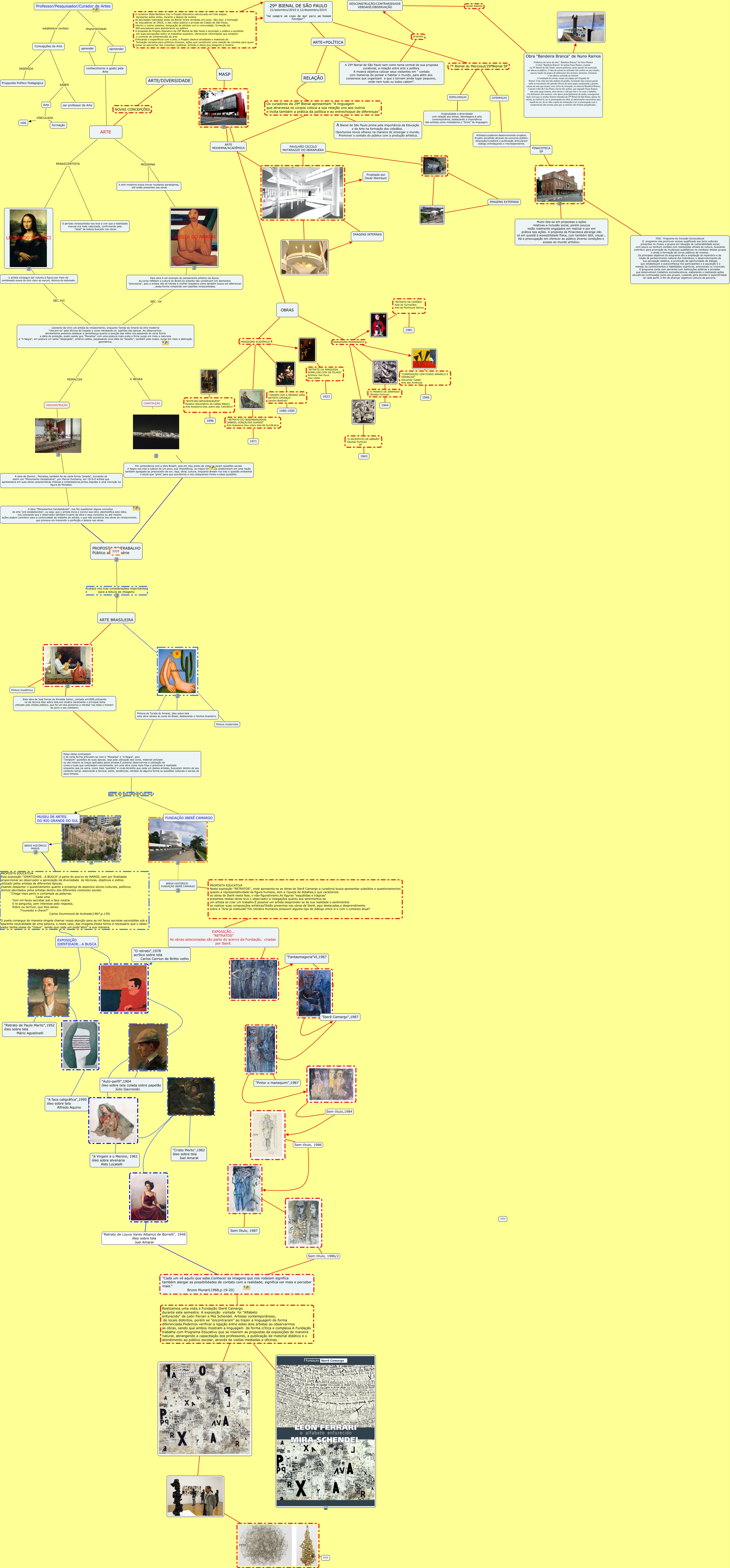 Esse mapa conceitual, produzido no IHMC CmapTools, tem a informação relacionada a: professor pesquisador e curador, apreender ???? conhecimento e gosto pela Arte, "Auto-perfil",1904 óleo sobre tela colada sobre papelão Júlio Gavronski, ARTE+POLÍTICA ???? 29º BIENAL DE SÃO PAULO 21/setembro/2010 à 12/dezembro/2010 "Há sempre um copo de mar para um homem navegar", MASP ???? OBRAS, ???? ????, DESCONSTRUÇÃO/CONTRARIEDADE VERDADE/OBSERVAÇÃO NUNO RAMOS Obra "Bandeira Branca" de Nuno Ramos Polêmica em torno da obra “ Bandeira Branca” de Nuno Ramos O obra “Bandeira Branca” do artista Nuno Ramos, exposta na 29ª Bienal de São Paulo, causou polêmica, antes mesmo da exposição ser aberta ao público. O fato do artista ter utilizado três urubus na sua criação, causou reação de grupos de defensores dos animais, protestos, liminares e um abaixo assinado na internet. A instalação do artista, ocupa um espaço privilegiado da Bienal. Uma rede une três andares do prédio, formando uma imensa gaiola onde se encontram três grandes blocos de areia negra compactada e granito, caixas de som que tocam, com ciclos de execução, as músicas Bandeira Branca, Carcará e Boi da Cara Preta e havia três urubus, que segundo Nuno Ramos, tem uma carga intensa, entre morte e vida que tem a ver com o trabalho. Os defensores dos animais, com apoio, principalmente da mídia, conseguiram fazer com que os urubus fossem retirados da 29ª Bienal de São Paulo, apesar do artista, ao realizá-la, ter se preocupado em obter as autorizações necessárias para mantê-los ali, de ter tido o apoio da instituição e ter se preocupado com o cumprimento das normas para que os animais não fossem prejudicados., 29º BIENAL DE SÃO PAULO 21/setembro/2010 à 12/dezembro/2010 "Há sempre um copo de mar para um homem navegar" 7ª Bienal do Mercosul/29ªBienal SP DIFERENÇAS, FUNDAÇÃO IBERÊ CAMARGO BREVE HISTÓRICO FUNDAÇÃO IBERÊ CAMARGO, ???? ???? IMAGENS EXTERNAS, Em consonância com a obra Breath, pois em meu ponto de vista destacam questões sociais A Negra nos traz a cultura de um povo, sua importância, os traços fortes que predominam em uma nação também agregado ao preconceito de cor, raça, etnia, cultura, enquanto Breath nos traz a questão ambiental e social que "grita" para que acordemos e nos coloquemos frente a estas questões. ???? PROPOSTA DE TRABALHO Público alvo:8ªsérie, o artista consegue dar volume à figura por meio de sombreado suave do tom claro ao escuro, técnica do esfumato. SÉC.XVI Leonardo da Vinci um artista do renascimento, enquanto Tarsila do Amaral da Arte moderna "chocam-se" pela técnica do traçado e cores retratando os padrões das épocas .Ao observarmos atentamente podemos destacar a semelhança quanto à posição das mãos nos passando de certa forma a idéia de proteção, pudor,sendo que "Monalisa" com uma postura mais ereta e firme surge em meio a natureza e "A Negra", em postura um tanto "despojada", ombros caídos, pepassando uma idéia de "desafio", também pela nudez, surge em meio a abstração geométrica., ARTE+POLÍTICA ???? RELAÇÃO, EXPOSIÇÃO IDENTIDADE...A BUSCA, EXPOSIÇÃO IDENTIDADE...A BUSCA ????, ARTE BRASILEIRA ABAPORU Pintura modernista, PAVILHÃO CICCILO MATARAZZO DO IBIRAPUERA ???? IMAGENS EXTERNAS, MASP A curadora Stela Barbiere traz o Projeto Educativo estruturado em três etapas. Apresenta ações antes, durante e depois da mostra. As atividades realizadas antes da Bienal foram divididas em eixos. São eles: a formação de educadores de ONGS, e das redes publica e privada da Cidade de São Paulo, interior e outros estados; integração de artistas com a comunidade; formação de 300 educadores para atendimento ao público. A proposta do Projeto Educativo da 29ª Bienal de São Paulo é encorajar o público a acreditar em suas percepções sobre os trabalhos expostos, oferecendo informações que ampliem o universo de compreensão da arte. Enfocando a experiência com a arte, o Projeto oferece atividades e materiais de formação variados para públicos diversos, ações que constituem uma coleção de convites para quem quiser se aproximar dos conceitos, poéticas, artistas e obras que integram a mostra. 29º BIENAL DE SÃO PAULO 21/setembro/2010 à 12/dezembro/2010 "Há sempre um copo de mar para um homem navegar", EXPOSIÇÃO IDENTIDADE...A BUSCA "Retrato de Paulo Maritz",1952 óleo sobre tela Mário Agostinelli, Esta obra é um exemplo do pensamento artístico da época. As cores refletem a cultura do Brasil;no entanto não constituem em elementos "pitorescos", pois a artista não só retrata a mulher brasileira como também busca um diferencial , desta forma rompendo com padrões renascentistas. SÉC. XX Leonardo da Vinci um artista do renascimento, enquanto Tarsila do Amaral da Arte moderna "chocam-se" pela técnica do traçado e cores retratando os padrões das épocas .Ao observarmos atentamente podemos destacar a semelhança quanto à posição das mãos nos passando de certa forma a idéia de proteção, pudor,sendo que "Monalisa" com uma postura mais ereta e firme surge em meio a natureza e "A Negra", em postura um tanto "despojada", ombros caídos, pepassando uma idéia de "desafio", também pela nudez, surge em meio a abstração geométrica., ???? "A face caligráfica",1995 óleo sobre tela Alfredo Aquino