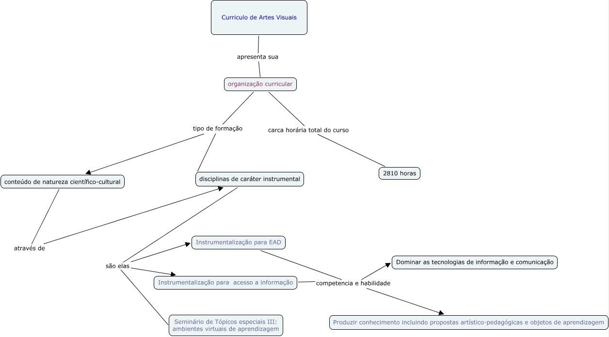 Esse mapa conceitual, produzido no IHMC CmapTools, tem a informação relacionada a: alda cmap 1, Instrumentalização para EAD competencia e habilidade Produzir conhecimento incluindo propostas artístico-pedagógicas e objetos de aprendizagem, organização curricular tipo de formação disciplinas de caráter instrumental, organização curricular carca horária total do curso 2810 horas, disciplinas de caráter instrumental são elas Instrumentalização para EAD, Instrumentalização para acesso a informação competencia e habilidade Dominar as tecnologias de informação e comunicação, Instrumentalização para EAD competencia e habilidade Dominar as tecnologias de informação e comunicação, Instrumentalização para acesso a informação competencia e habilidade Produzir conhecimento incluindo propostas artístico-pedagógicas e objetos de aprendizagem, Curriculo de Artes Visuais apresenta sua organização curricular, conteúdo de natureza científico-cultural através de disciplinas de caráter instrumental, disciplinas de caráter instrumental são elas Instrumentalização para acesso a informação, organização curricular tipo de formação conteúdo de natureza científico-cultural, disciplinas de caráter instrumental são elas Seminário de Tópicos especiais III: ambientes virtuais de aprendizagem