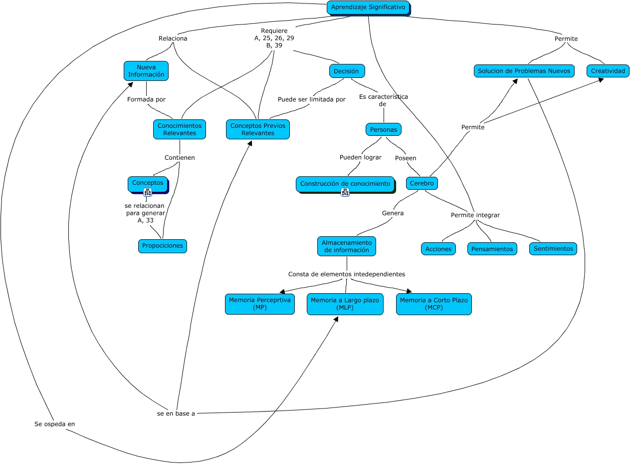 Este Cmap, tiene información relacionada con: Aprendizaje Significativo, Aprendizaje Significativo Permite integrar Pensamientos, Aprendizaje Significativo Permite integrar Sentimientos, Cerebro Genera Almacenamiento de información, Almacenamiento de información Consta de elementos intedependientes Memoria a Largo plazo (MLP), Aprendizaje Significativo Relaciona Conceptos Previos Relevantes, Decisión Es característica de Personas, Conceptos se relacionan para generar A, 33 Propociciones, Personas Poseen Cerebro, Personas Pueden lograr Construcción de conocimiento, Cerebro Permite Creatividad, Aprendizaje Significativo Se ospeda en Memoria a Largo plazo (MLP), Cerebro Permite integrar Sentimientos, Aprendizaje Significativo Permite integrar Acciones, Solucion de Problemas Nuevos se en base a Nueva Información, Aprendizaje Significativo Permite Solucion de Problemas Nuevos, Aprendizaje Significativo Relaciona Nueva Información, Almacenamiento de información Consta de elementos intedependientes Memoria Perceprtiva (MP), Aprendizaje Significativo Requiere A, 25, 26, 29 B, 39 Conocimientos Relevantes, Almacenamiento de información Consta de elementos intedependientes Memoria a Corto Plazo (MCP), Cerebro Permite Solucion de Problemas Nuevos