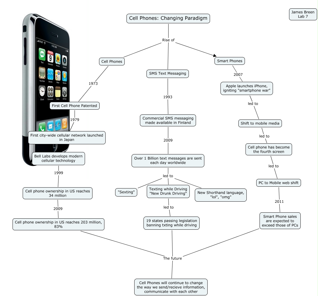 This Concept Map, created with IHMC CmapTools, has information related to: Breen, James - Paradigm Report, Cell phone has become the fourth screen led to PC to Mobile web shift, Texting while Driving "New Drunk Driving" led to 19 states passing legislation banning txting while driving, Commercial SMS messaging made available in Finland 2009 Over 1 Billion text messages are sent each day worldwide, Cell Phones: Changing Paradigm Rise of Cell Phones, 19 states passing legislation banning txting while driving The future Cell Phones will continue to change the way we send/recieve information, communicate with each other, First city-wide cellular network launched in Japan 1984 Bell Labs develops modern cellular technology, Cell Phones 1973 First Cell Phone Patented, Smart Phone sales are expected to exceed those of PCs The future Cell Phones will continue to change the way we send/recieve information, communicate with each other, Over 1 Billion text messages are sent each day worldwide led to Texting while Driving "New Drunk Driving", Bell Labs develops modern cellular technology 1999 Cell phone ownership in US reaches 34 million, Cell phone ownership in US reaches 203 million, 83% The future Cell Phones will continue to change the way we send/recieve information, communicate with each other, Cell Phones: Changing Paradigm Rise of SMS Text Messaging, SMS Text Messaging 1993 Commercial SMS messaging made available in Finland, Apple launches iPhone, igniting "smartphone war" led to Shift to mobile media, Cell Phones: Changing Paradigm Rise of Smart Phones, Smart Phones 2007 Apple launches iPhone, igniting "smartphone war", First Cell Phone Patented 1979 First city-wide cellular network launched in Japan, PC to Mobile web shift 2011 Smart Phone sales are expected to exceed those of PCs, Cell phone ownership in US reaches 34 million 2009 Cell phone ownership in US reaches 203 million, 83%, Shift to mobile media led to Cell phone has become the fourth screen