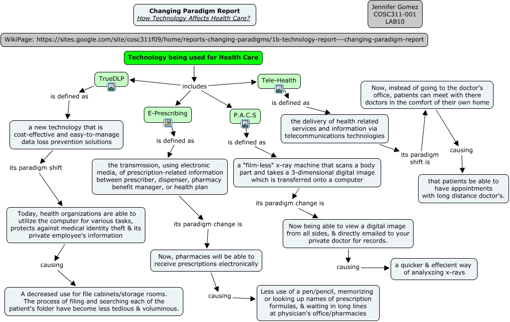 This Concept Map, created with IHMC CmapTools, has information related to: Gomez,Jennifer_LAB10_CMAPS, Today, health organizations are able to utilize the computer for various tasks, protects against medical identity theft & its private employee's information causing A decreased use for file cabinets/storage rooms. The process of filing and searching each of the patient's folder have become less tedious & voluminous., P.A.C.S is defined as a "film-less" x-ray machine that scans a body part and takes a 3-dimensional digital image which is transferred onto a computer, Technology being used for Health Care includes TrueDLP, Now, pharmacies will be able to receive prescriptions electronically causing Less use of a pen/pencil, memorizing or looking up names of prescription formulas, & waiting in long lines at physician's office/pharmacies, the transmission, using electronic media, of prescription-related information between prescriber, dispenser, pharmacy benefit manager, or health plan its paradigm change is Now, pharmacies will be able to receive prescriptions electronically, Technology being used for Health Care includes Tele-Health, Now, instead of going to the doctor's office, patients can meet with there doctors in the comfort of their own home causing that patients be able to have appointments with long distance doctor's., TrueDLP is defined as a new technology that is cost-effective and easy-to-manage data loss prevention solutions, the delivery of health related services and information via telecommunications technologies its paradigm shift is Now, instead of going to the doctor's office, patients can meet with there doctors in the comfort of their own home, a "film-less" x-ray machine that scans a body part and takes a 3-dimensional digital image which is transferred onto a computer its paradigm change is Now being able to view a digital image from all sides, & directly emailed to your private doctor for records., a new technology that is cost-effective and easy-to-manage data loss prevention solutions its paradigm shift Today, health organizations are able to utilize the computer for various tasks, protects against medical identity theft & its private employee's information, Technology being used for Health Care includes E-Prescribing, Technology being used for Health Care includes P.A.C.S, Tele-Health is defined as the delivery of health related services and information via telecommunications technologies, Now being able to view a digital image from all sides, & directly emailed to your private doctor for records. causing a quicker & effecient way of analyxzing x-rays, E-Prescribing is defined as the transmission, using electronic media, of prescription-related information between prescriber, dispenser, pharmacy benefit manager, or health plan