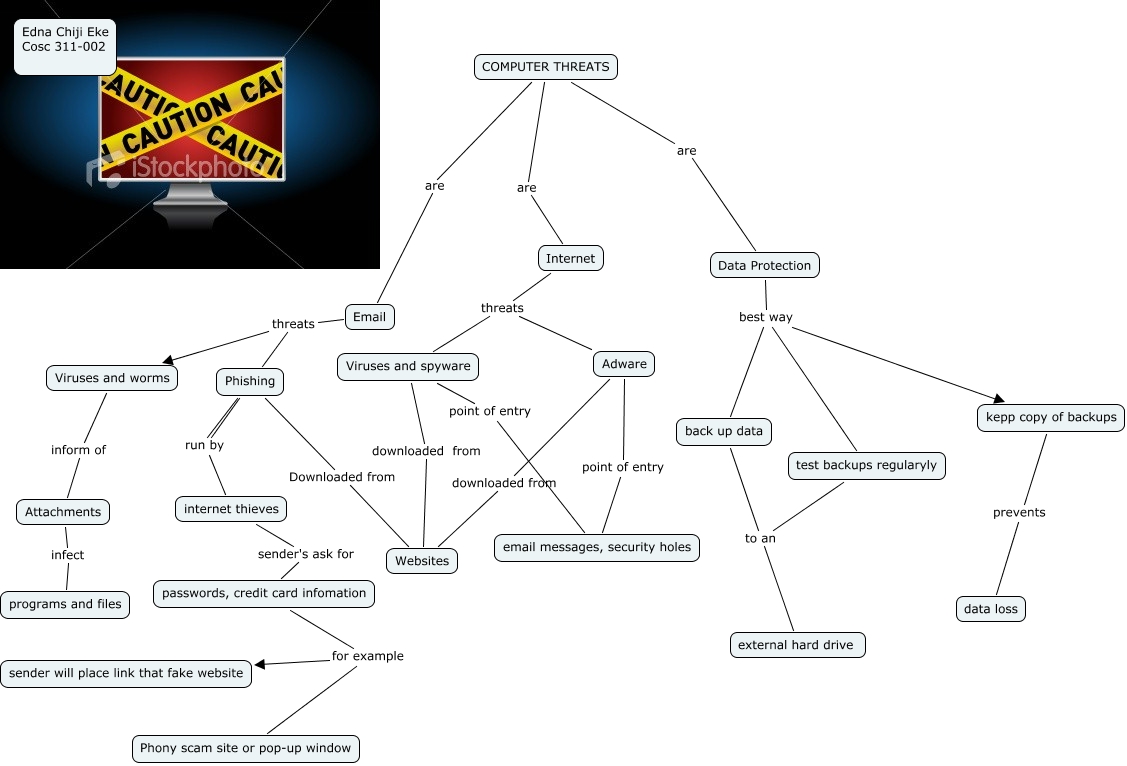 This Concept Map, created with IHMC CmapTools, has information related to: eke Edna, Phishing run by internet thieves, Viruses and spyware downloaded from Websites, Email threats Phishing, passwords, credit card infomation for example Phony scam site or pop-up window, back up data to an external hard drive, Adware point of entry email messages, security holes, Viruses and spyware point of entry email messages, security holes, Data Protection best way back up data, COMPUTER THREATS are Email, Data Protection best way test backups regularyly, passwords, credit card infomation for example sender will place link that fake website, test backups regularyly to an external hard drive, internet thieves sender's ask for passwords, credit card infomation, Phishing run by internet thieves, Email threats Viruses and worms, kepp copy of backups prevents data loss, Internet threats Viruses and spyware, Adware downloaded from Websites, Internet threats Adware, Data Protection best way kepp copy of backups