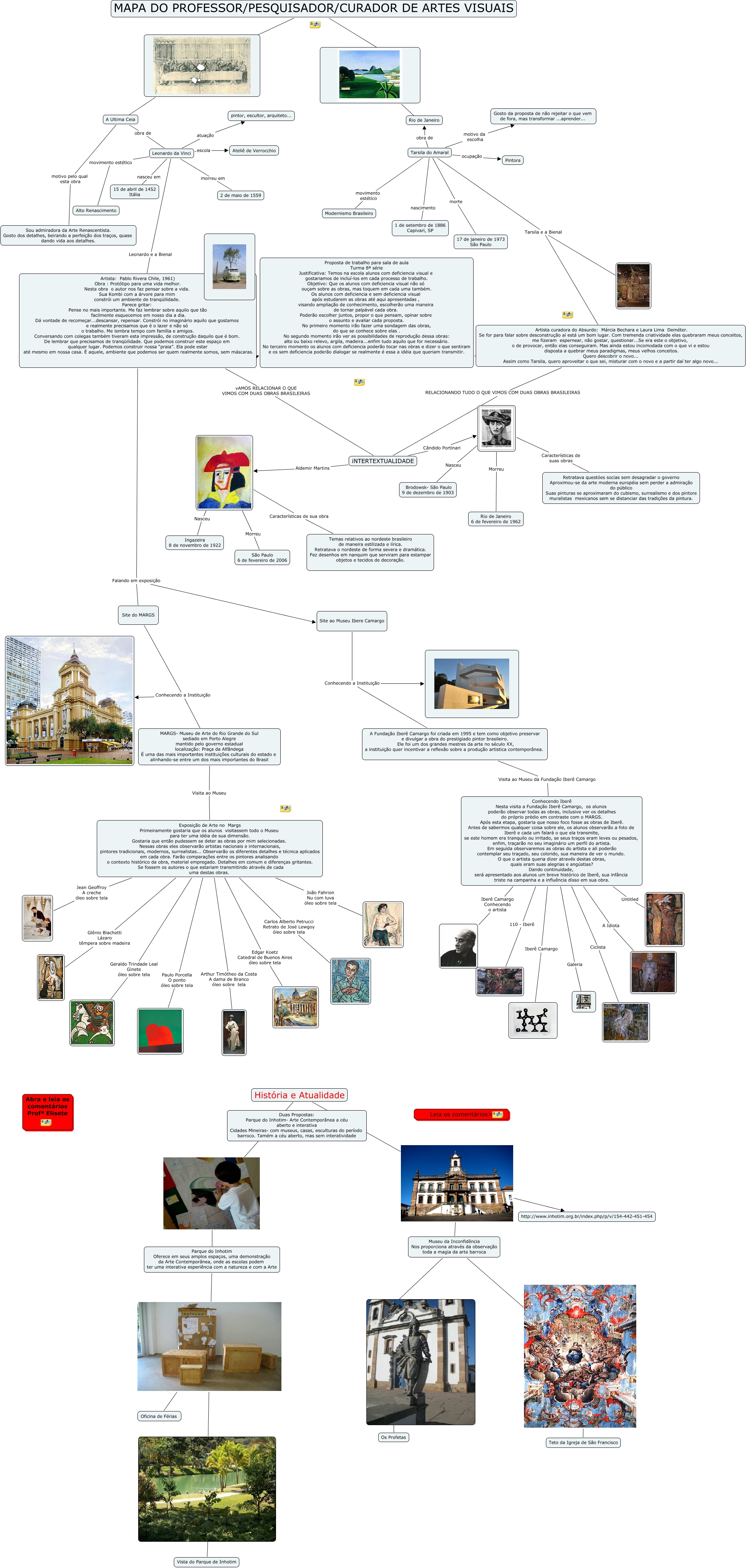Esse mapa conceitual, produzido no IHMC CmapTools, tem a informação relacionada a: Mapa do Professor-Pesquisador-curador-Atual, Parque do Inhotim Oferece em seus amplos espaços, uma demonstração da Arte Contemporânea, onde as escolas podem ter uma interativa esperiência com a natureza e com a Arte ???? Oficina de Férias, Conhecendo Iberê Nesta visita a Fundação Iberê Camargo, os alunos poderão observar todas as obras, inclusive ver os detalhes do próprio prédio em contraste com o MARGS. Após esta etapa, gostaria que nosso foco fosse as obras de Iberê. Antes de sabermos qualquer coisa sobre ele, os alunos observarão a foto de Iberê e cada um falará o que ela transmite, se este homem era tranquilo ou irritado, se seus traços eram leves ou pesados, enfim, traçarão no seu imaginário um perfil do artista. Em seguida observaremos as obras do artista e ali poderão contemplar seu traçado, seu colorido, sua maneira de ver o mundo. O que o artista queria dizer através destas obras, quais eram suas alegrias e angústias? Dando continuidade, será apresentado aos alunos um breve histórico de Iberê, sua infância triste na campanha e a influência disso em sua obra. Iberê Camargo, Exposição de Arte no Margs Primeiramente gostaria que os alunos visitassem todo o Museu para ter uma idéia de sua dimensão. Gostaria que então pudessem se deter as obras por mim selecionadas. Nessas obras eles observarão artistas nacionais e internacionais, pintores tradicionais, modernos, surrealistas... Observarão os diferentes detalhes e técnica aplicados em cada obra. Farão comparações entre os pintores analisando o contexto histórico da obra, material empregado. Detalhes em comum e diferenças gritantes. Se fossem os autores o que estariam transmitindo através de cada uma destas obras. Edgar Koetz Catedral de Buenos Aires óleo sobre tela, Rio de Janeiro, Leonardo da Vinci escola Ateliê de Verrocchio, História e Atualidade ???? Museu da Inconfidência Nos proporciona através da observação toda a magia da arte barroca, Conhecendo Iberê Nesta visita a Fundação Iberê Camargo, os alunos poderão observar todas as obras, inclusive ver os detalhes do próprio prédio em contraste com o MARGS. Após esta etapa, gostaria que nosso foco fosse as obras de Iberê. Antes de sabermos qualquer coisa sobre ele, os alunos observarão a foto de Iberê e cada um falará o que ela transmite, se este homem era tranquilo ou irritado, se seus traços eram leves ou pesados, enfim, traçarão no seu imaginário um perfil do artista. Em seguida observaremos as obras do artista e ali poderão contemplar seu traçado, seu colorido, sua maneira de ver o mundo. O que o artista queria dizer através destas obras, quais eram suas alegrias e angústias? Dando continuidade, será apresentado aos alunos um breve histórico de Iberê, sua infância triste na campanha e a influência disso em sua obra. Untitled, Museu da Inconfidência Nos proporciona através da observação toda a magia da arte barroca ???? Os Profetas, Morreu Rio de Janeiro 6 de fevereiro de 1962, Conhecendo Iberê Nesta visita a Fundação Iberê Camargo, os alunos poderão observar todas as obras, inclusive ver os detalhes do próprio prédio em contraste com o MARGS. Após esta etapa, gostaria que nosso foco fosse as obras de Iberê. Antes de sabermos qualquer coisa sobre ele, os alunos observarão a foto de Iberê e cada um falará o que ela transmite, se este homem era tranquilo ou irritado, se seus traços eram leves ou pesados, enfim, traçarão no seu imaginário um perfil do artista. Em seguida observaremos as obras do artista e ali poderão contemplar seu traçado, seu colorido, sua maneira de ver o mundo. O que o artista queria dizer através destas obras, quais eram suas alegrias e angústias? Dando continuidade, será apresentado aos alunos um breve histórico de Iberê, sua infância triste na campanha e a influência disso em sua obra. 110 - Iberê, Exposição de Arte no Margs Primeiramente gostaria que os alunos visitassem todo o Museu para ter uma idéia de sua dimensão. Gostaria que então pudessem se deter as obras por mim selecionadas. Nessas obras eles observarão artistas nacionais e internacionais, pintores tradicionais, modernos, surrealistas... Observarão os diferentes detalhes e técnica aplicados em cada obra. Farão comparações entre os pintores analisando o contexto histórico da obra, material empregado. Detalhes em comum e diferenças gritantes. Se fossem os autores o que estariam transmitindo através de cada uma destas obras. João Fahrion Nu com luva óleo sobre tela, Tarsila do Amaral morte 17 de janeiro de 1973 São Paulo, História e Atualidade ???? http://www.inhotim.org.br/index.php/p/v/154-442-451-454, Morreu São Paulo 6 de fevereiro de 2006, Conhecendo Iberê Nesta visita a Fundação Iberê Camargo, os alunos poderão observar todas as obras, inclusive ver os detalhes do próprio prédio em contraste com o MARGS. Após esta etapa, gostaria que nosso foco fosse as obras de Iberê. Antes de sabermos qualquer coisa sobre ele, os alunos observarão a foto de Iberê e cada um falará o que ela transmite, se este homem era tranquilo ou irritado, se seus traços eram leves ou pesados, enfim, traçarão no seu imaginário um perfil do artista. Em seguida observaremos as obras do artista e ali poderão contemplar seu traçado, seu colorido, sua maneira de ver o mundo. O que o artista queria dizer através destas obras, quais eram suas alegrias e angústias? Dando continuidade, será apresentado aos alunos um breve histórico de Iberê, sua infância triste na campanha e a influência disso em sua obra. Galeria, Leonardo da Vinci nasceu em 15 de abril de 1452 Itália, Conhecendo Iberê Nesta visita a Fundação Iberê Camargo, os alunos poderão observar todas as obras, inclusive ver os detalhes do próprio prédio em contraste com o MARGS. Após esta etapa, gostaria que nosso foco fosse as obras