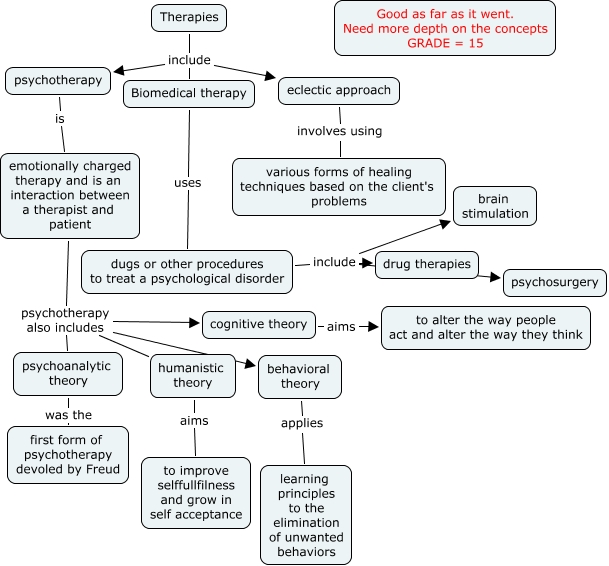 Emly Buchanan 0166 Ch. 14, emotionally charged therapy and is an interaction between a therapist and patient psychotherapy also includes humanistic theory, humanistic theory aims to improve selffullfilness and grow in self acceptance, emotionally charged therapy and is an interaction between a therapist and patient psychotherapy also includes psychoanalytic theory, emotionally charged therapy and is an interaction between a therapist and patient psychotherapy also includes cognitive theory, dugs or other procedures to treat a psychological disorder include brain stimulation, dugs or other procedures to treat a psychological disorder include psychosurgery, Therapies include psychotherapy, dugs or other procedures to treat a psychological disorder include drug therapies, psychoanalytic theory was the first form of psychotherapy devoled by Freud, Biomedical therapy uses dugs or other procedures to treat a psychological disorder