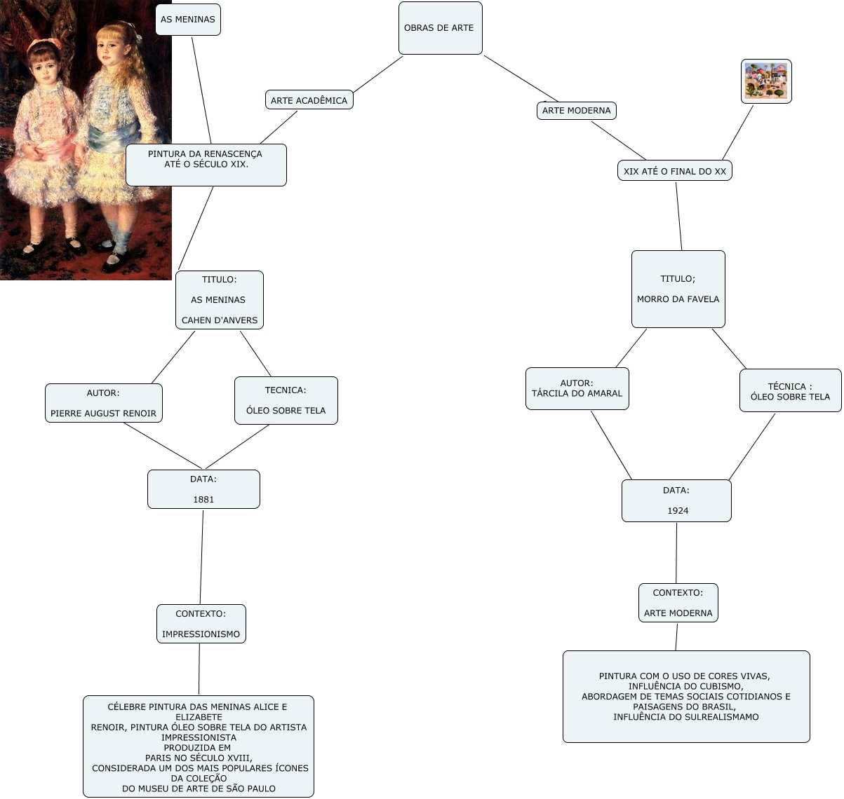 Esse mapa conceitual, produzido no IHMC CmapTools, tem a informação relacionada a: OBRA DE ARTE ACADÊMICA E ARTE MODERNA, XIX ATÉ O FINAL DO XX ???? TITULO; MORRO DA FAVELA, TITULO; MORRO DA FAVELA ???? AUTOR: TÁRCILA DO AMARAL, PINTURA DA RENASCENÇA ATÉ O SÉCULO XIX. ???? TITULO: AS MENINAS CAHEN D'ANVERS, TÉCNICA : ÓLEO SOBRE TELA ???? DATA: 1924, CONTEXTO: ARTE MODERNA ???? PINTURA COM O USO DE CORES VIVAS, INFLUÊNCIA DO CUBISMO, ABORDAGEM DE TEMAS SOCIAIS COTIDIANOS E PAISAGENS DO BRASIL, INFLUÊNCIA DO SULREALISMAMO, AS MENINAS ???? PINTURA DA RENASCENÇA ATÉ O SÉCULO XIX., TITULO: AS MENINAS CAHEN D'ANVERS ???? TECNICA: ÓLEO SOBRE TELA, TITULO: AS MENINAS CAHEN D'ANVERS ???? AUTOR: PIERRE AUGUST RENOIR, CONTEXTO: IMPRESSIONISMO ???? CÉLEBRE PINTURA DAS MENINAS ALICE E ELIZABETE RENOIR, PINTURA ÓLEO SOBRE TELA DO ARTISTA IMPRESSIONISTA PRODUZIDA EM PARIS NO SÉCULO XVIII, CONSIDERADA UM DOS MAIS POPULARES ÍCONES DA COLEÇÃO DO MUSEU DE ARTE DE SÃO PAULO, AUTOR: TÁRCILA DO AMARAL ???? DATA: 1924, AUTOR: PIERRE AUGUST RENOIR ???? DATA: 1881, OBRAS DE ARTE ???? ????, OBRAS DE ARTE ???? ARTE MODERNA, ARTE MODERNA ???? XIX ATÉ O FINAL DO XX, TITULO; MORRO DA FAVELA ???? TÉCNICA : ÓLEO SOBRE TELA, ???? XIX ATÉ O FINAL DO XX, ARTE ACADÊMICA ???? PINTURA DA RENASCENÇA ATÉ O SÉCULO XIX., DATA: 1881 ???? CONTEXTO: IMPRESSIONISMO, DATA: 1924 ???? CONTEXTO: ARTE MODERNA, TECNICA: ÓLEO SOBRE TELA ???? DATA: 1881