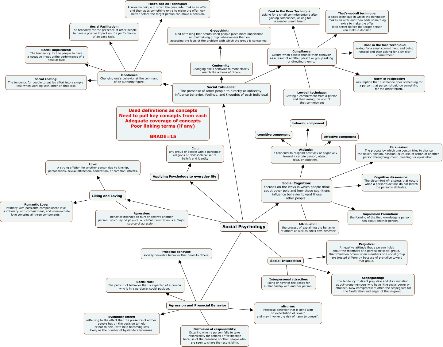Chapter 12- Kelsey Snyder, Attitude: a tendency to respond postivley or negatively toward a certain person, object, idea, or situation. Affective component, Social Cognition: Focuses on the ways in which people think about other pole and how those cognitions influence behavior toward those other people. Cognitive dissonance: The discomfort ofr distress that occurs when a person's actions do not match the person's attitudes., Obedience: Changing one's behavior at the command of an authority figure. Social Impairment: The tendaency for the people to have a negative impat onthe performance of a difficult task, Agression and Prosocial Behavior Disffusion of responsibility: Occuring when a person fails to take respnsibility for actions or for inaction because of the presence of other people who are seen to share the respnsibility., Applying Psychology to everyday life Cult: any group of people with a particualr religions or philosophical set of beliefs and identity, Social Interaction Interpersonal attraction: liking or havingt the desire for a relationship with another person., Compliance: Occurs when people chance their behavior as a result of another person or group asking or directing them to. Lowball technique: Getting a commitment from a person and then rasing the cost of that commitment, Liking and Loving Romantic Love: intimacy with passionm companionate love is imtimacy with commitment, and consummate love contains all three componants., Social Cognition: Focuses on the ways in which people think about other pole and how those cognitions influence behavior toward those other people. Attitude: a tendency to respond postivley or negatively toward a certain person, object, idea, or situation., Social Interaction Scapegoating: the tendency to direct prejudice and discrimination at out-groupmembers who have little social power or influence. New immigrantsare often the scapegoats for the frusttration and anger of the in-group.