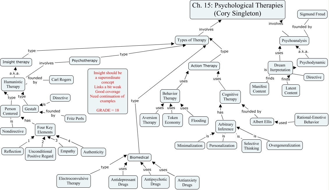 This Concept Map, created with IHMC CmapTools, has information related to: Cory Singleton - Ch. 15, Psychodynamic a.k.a. Psychoanalysis, Biomedical type Types of Therapy, Token Economy uses Behavior Therapy, Action Therapy type Types of Therapy, Arbitrary Inference has Cognitive Therapy, Aversion Therapy uses Behavior Therapy, Authenticity 4 Four Key Elements, Unconditional Positive Regard 2 Four Key Elements, Directive is Psychodynamic, Person Centered type Humanistic Therapy, Selective Thinking is Arbitrary Inference, Insight therapy type Types of Therapy, Fritz Perls founded by Gestalt, Gestalt type Humanistic Therapy, Empathy 3 Four Key Elements, Personalization is Arbitrary Inference, Psychotherapy type Types of Therapy, Overgeneralization is Arbitrary Inference, Behavior Therapy uses Action Therapy, Types of Therapy involves Ch. 15: Psychological Therapies (Cory Singleton)