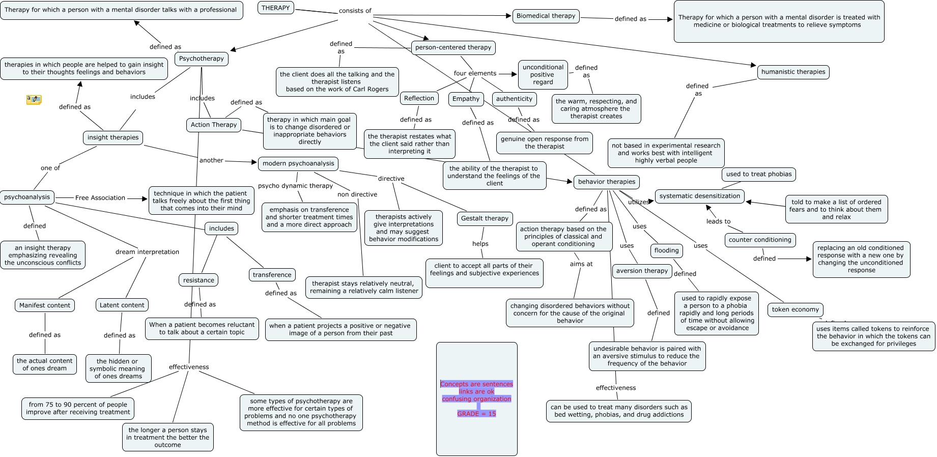 This Concept Map, created with IHMC CmapTools, has information related to: Andrew Frisbie 166 ch 15, behavior therapies defined as action therapy based on the principles of classical and operant conditioning, modern psychoanalysis directive Gestalt therapy, Psychotherapy defined as Therapy for which a person with a mental disorder talks with a professional, THERAPY consists of person-centered therapy, Psychotherapy effectiveness the longer a person stays in treatment the better the outcome, Empathy defined as the ability of the therapist to understand the feelings of the client, Psychotherapy effectiveness from 75 to 90 percent of people improve after receiving treatment, person-centered therapy defined as the client does all the talking and the therapist listens based on the work of Carl Rogers, Latent content defined as the hidden or symbolic meaning of ones dreams, behavior therapies utilizes systematic desensitization, Gestalt therapy helps client to accept all parts of their feelings and subjective experiences, behavior therapies effectiveness can be used to treat many disorders such as bed wetting, phobias, and drug addictions, insight therapies defined as therapies in which people are helped to gain insight to their thoughts feelings and behaviors, behavior therapies uses aversion therapy, person-centered therapy four elements authenticity, modern psychoanalysis non directive therapist stays relatively neutral, remaining a relatively calm listener, THERAPY consists of behavior therapies, insight therapies one of psychoanalysis, resistance defined as When a patient becomes reluctant to talk about a certain topic, told to make a list of ordered fears and to think about them and relax ???? systematic desensitization