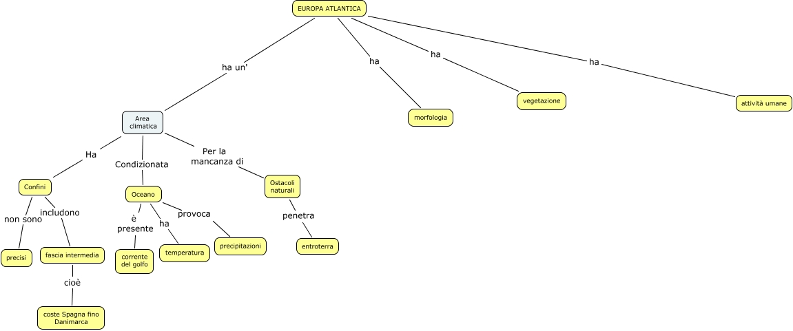 Questa Cmap, creata con IHMC CmapTools, contiene informazioni relative a: europaatlantica-04, Area climatica Condizionata Oceano, Area climatica Per la mancanza di Ostacoli naturali, Ostacoli naturali penetra entroterra, EUROPA ATLANTICA ha morfologia, fascia intermedia cioè coste Spagna fino Danimarca, Oceano è presente corrente del golfo, EUROPA ATLANTICA ha vegetazione, Area climatica Ha Confini, EUROPA ATLANTICA ha un' Area climatica, Confini non sono precisi, EUROPA ATLANTICA ha attività umane, Oceano ha temperatura, Oceano provoca precipitazioni, Confini includono fascia intermedia