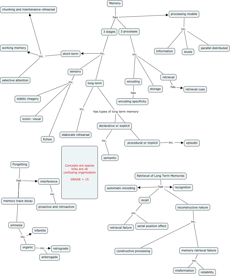 This Concept Map, created with IHMC CmapTools, has information related to: Kodi Bass Chapter 6 memory, organic inc. anterogade, 3 processes inc. storage, reconstructive nature inc. memory retrieval failure, 3 stages inc. long-term, retrieval has retrieval cues, recall inc. retrieval failure, short-term inc. chunking and maintenance rehearsal, procedural or implicit inc. episodic, interference inc. proactive and retroactive, declarative or explicit inc. semantic, 3 stages inc. short-term, recall inc. serial position effect, Memory has processing models, Forgetting has amnesia, memory retrieval failure inc. reliability, 3 processes inc. encoding, amnesia inc. organic, processing models inc. parallel distributed, Memory has 3 stages, Memory has 3 processes