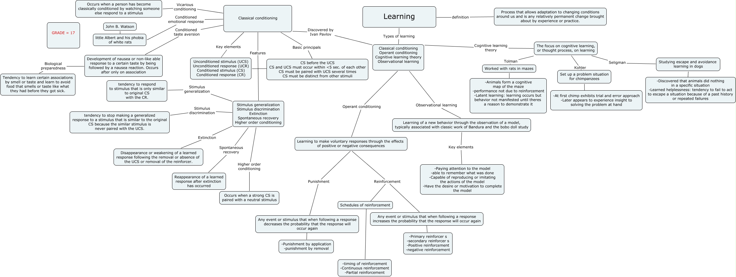 This Concept Map, created with IHMC CmapTools, has information related to: shevat cmap learning, Stimulus generalization Stimulus discrimination Extinction Spontaneous recovery Higher order conditioning Spontaneous recovery Reappearance of a learned response after extinction has occurred, Classical conditioning Basic principals CS before the UCS CS and UCS must occur within ɝ sec. of each other CS must be paired with UCS several times CS must be distinct from other stimuli, Development of nausea or non-like able response to a certain taste by being followed by a nausea reaction. Occurs after only on association Biological preparedness Tendency to learn certain associations by smell or taste and learn to avoid food that smells or taste like what they had before they got sick., -Primary reinforcer s -secondary reinforcer s -Positive reinforcement -negative reinforcement ???? Any event or stimulus that when following a response increases the probability that the response will occur again, Classical conditioning Vicarious conditioning Occurs when a person has become classically conditioned by watching someone else respond to a stimulus, Any event or stimulus that when following a response increases the probability that the response will occur again Reinforcement -timing of reinforcement -Continuous reinforcement -Partial reinforcement, Classical conditioning Features Stimulus generalization Stimulus discrimination Extinction Spontaneous recovery Higher order conditioning, Any event or stimulus that when following a response decreases the probability that the response will occur again Punishment Learning to make voluntary responses through the effects of positive or negative consequences, -Punishment by application -punishment by removal ???? Any event or stimulus that when following a response decreases the probability that the response will occur again, Classical conditioning Conditioned emotional response little Albert and his phobia of white rats, John B. Watson ???? little Albert and his phobia of white rats, -Animals form a cognitive map of the maze -performance not due to reinforcement -Latent learning: learning occurs but behavior not manifested until theres a reason to demonstrate it ???? Worked with rats in mazes, -At first chimp exhibits trial and error approach -Later appears to experience insight to solving the problem at hand ???? Set up a problem situation for chimpanzees, The focus on cognitive learning, or thought process, on learning Kohler Set up a problem situation for chimpanzees, Stimulus generalization Stimulus discrimination Extinction Spontaneous recovery Higher order conditioning Stimulus generalization tendency to respond to stimulus that is only similar to original CS with the CR., Unconditioned stimulus (UCS) Unconditioned response (UCR) Conditioned stimulus (CS) Conditioned response (CR) ???? CS before the UCS CS and UCS must occur within ɝ sec. of each other CS must be paired with UCS several times CS must be distinct from other stimuli, Classical conditioning Conditioned taste aversion Development of nausea or non-like able response to a certain taste by being followed by a nausea reaction. Occurs after only on association, Classical conditioning Operant conditioning Cognitive learning theory Observational learning Cognitive learning theory The focus on cognitive learning, or thought process, on learning, The focus on cognitive learning, or thought process, on learning Seligman Studying escape and avoidance learning in dogs, Any event or stimulus that when following a response increases the probability that the response will occur again Reinforcement Learning to make voluntary responses through the effects of positive or negative consequences