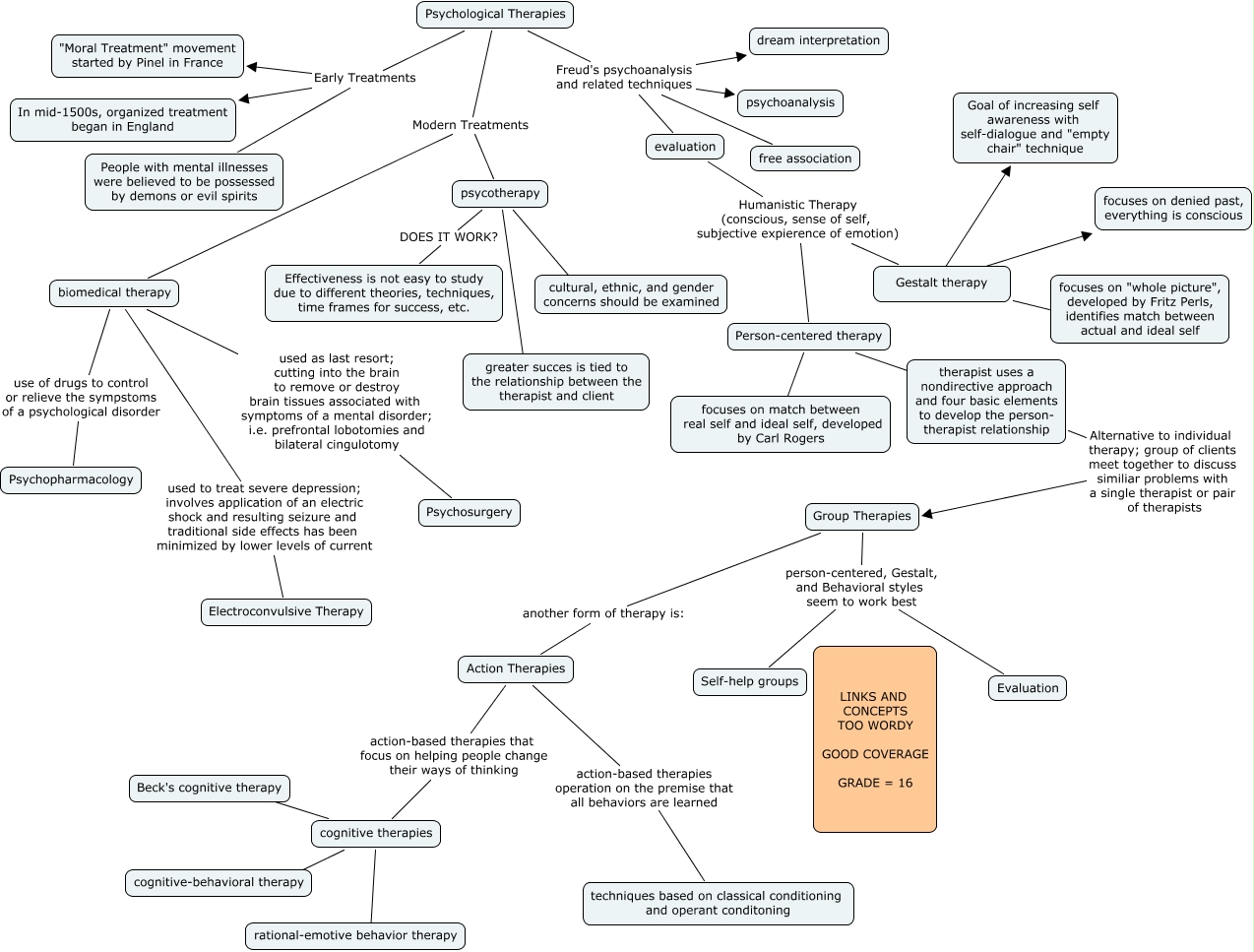 This Concept Map, created with IHMC CmapTools, has information related to: Rachel Richardson CH 15, Action Therapies action-based therapies operation on the premise that all behaviors are learned techniques based on classical conditioning and operant conditoning, psycotherapy cultural, ethnic, and gender concerns should be examined, Gestalt therapy ???? focuses on denied past, everything is conscious, Psychological Therapies Modern Treatments psycotherapy, Psychological Therapies Early Treatments People with mental illnesses were believed to be possessed by demons or evil spirits, evaluation Humanistic Therapy (conscious, sense of self, subjective expierence of emotion) Person-centered therapy, Psychological Therapies Modern Treatments biomedical therapy, Psychological Therapies Early Treatments "Moral Treatment" movement started by Pinel in France, Person-centered therapy ???? therapist uses a nondirective approach and four basic elements to develop the person- therapist relationship, Psychological Therapies Freud's psychoanalysis and related techniques psychoanalysis, evaluation Humanistic Therapy (conscious, sense of self, subjective expierence of emotion) Gestalt therapy, cognitive therapies ???? rational-emotive behavior therapy, Group Therapies person-centered, Gestalt, and Behavioral styles seem to work best Evaluation, Psychological Therapies Freud's psychoanalysis and related techniques free association, cognitive therapies ???? Beck's cognitive therapy, biomedical therapy used as last resort; cutting into the brain to remove or destroy brain tissues associated with symptoms of a mental disorder; i.e. prefrontal lobotomies and bilateral cingulotomy Psychosurgery, Psychological Therapies Freud's psychoanalysis and related techniques evaluation, therapist uses a nondirective approach and four basic elements to develop the person- therapist relationship Alternative to individual therapy; group of clients meet together to discuss similiar problems with a single therapist or pair of therapists Group Therapies, Person-centered therapy ???? focuses on match between real self and ideal self, developed by Carl Rogers, Group Therapies another form of therapy is: Action Therapies