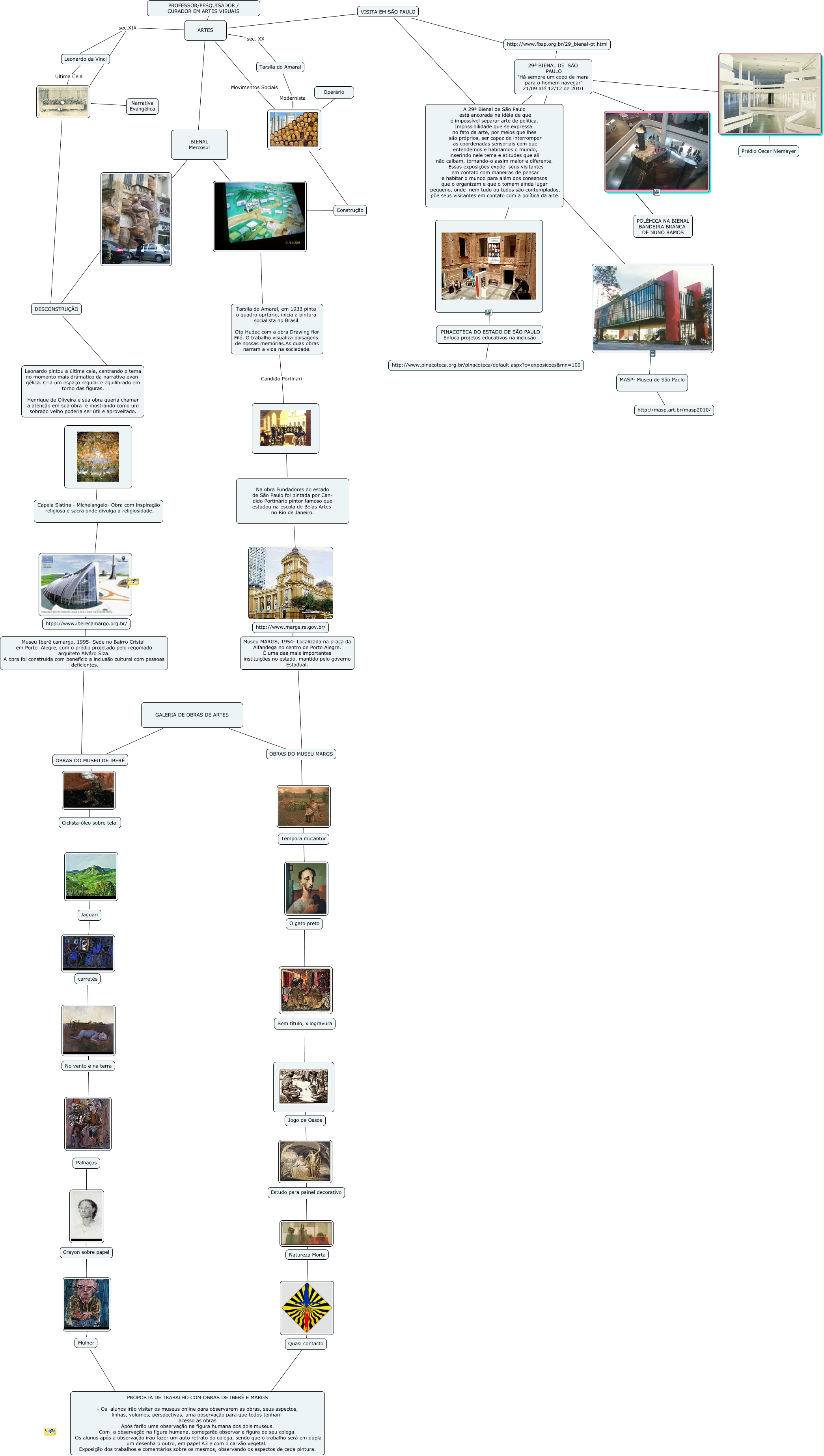 Esse mapa conceitual, produzido no IHMC CmapTools, tem a informação relacionada a: mapa, ARTES ???? BIENAL Mercosul, ???? Tempora mutantur, ARTES sec.XIX, ???? Capela Sistina - Michelangelo- Obra com inspiração religiosa e sacra onde divulga a religiosidade., Na obra Fundadores do estado de São Paulo foi pintada por Can- dido Portinário pintor famoso que estudou na escola de Belas Artes no Rio de Janeiro. ????, ARTES sec.XIX Leonardo da Vinci, ???? PINACOTECA DO ESTADO DE SÃO PAULO Enfoca projetos educativos na inclusão, ???? ???? Quasi contacto, ???? Jogo de Ossos, BIENAL Mercosul ????, Estudo para painel decorativo ????, ARTES ???? VISITA EM SÃO PAULO, VISITA EM SÃO PAULO ????, ???? Museu Iberê camargo, 1995- Sede no Bairro Cristal em Porto Alegre, com o prédio projetado pelo regomado arquiteto Alváro Siza. A obra foi construída com benefício a inclusão cultural com pessoas deficientes., O gato preto ???? ????, ???? Estudo para painel decorativo, Mulher ???? PROPOSTA DE TRABALHO COM OBRAS DE IBERÊ E MARGS - Os alunos irão visitar os museus online para observarem as obras, seus aspectos, linhas, volumes, perspectivas, uma observação para que todos tenham acesso as obras Após farão uma observação na figura humana dos dois museus. Com a observação na figura humana, começarão observar a figura de seu colega. Os alunos após a observação iráo fazer um auto retrato do colega, sendo que o trabalho será em dupla um desenha o outro, em papel A3 e com o carvão vegetal. Exposição dos trabalhos e comentários sobre os mesmos, observando os aspectos de cada pintura., GALERIA DE OBRAS DE ARTES ???? OBRAS DO MUSEU MARGS, No vento e na terra ???? ????, DESCONSTRUÇÃO ????