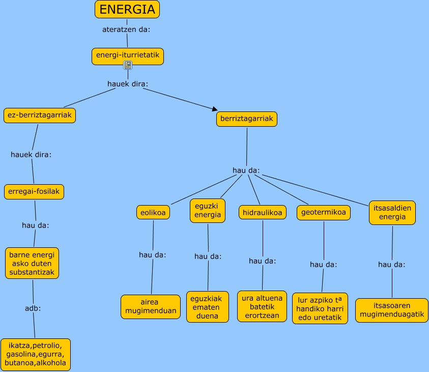 Este Cmap, tiene información relacionada con: ENERGIA2, berriztagarriak hau da: itsasaldien energia, barne energi asko duten substantizak adb: ikatza,petrolio, gasolina,egurra, butanoa,alkohola, hidraulikoa hau da: ura altuena batetik erortzean, geotermikoa hau da: lur azpiko tª handiko harri edo uretatik, berriztagarriak hau da: eguzki energia, berriztagarriak hau da: hidraulikoa, eolikoa hau da: airea mugimenduan, erregai-fosilak hau da: barne energi asko duten substantizak, berriztagarriak hau da: geotermikoa, energi-iturrietatik hauek dira: berriztagarriak, energi-iturrietatik hauek dira: ez-berriztagarriak, ez-berriztagarriak hauek dira: erregai-fosilak, itsasaldien energia hau da: itsasoaren mugimenduagatik, eguzki energia hau da: eguzkiak ematen duena, ENERGIA ateratzen da: energi-iturrietatik, berriztagarriak hau da: eolikoa
