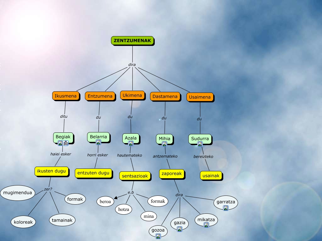 Este Cmap, tiene información relacionada con: Zentzumenak, ZENTZUMENAK dira Ikusmena, Azala hautemateko sentsazioak, zaporeak dira gozoa, Begiak haiei esker ikusten dugu, ZENTZUMENAK dira Ukimena, ikusten dugu zer? koloreak, zaporeak dira gozoa, ikusten dugu zer? tamainak, Mihia antzemateko zaporeak, zaporeak dira gazia, zaporeak dira gazia, sentsazioak e.b beroa, ZENTZUMENAK dira Dastamena, Dastamena du Mihia, Begiak haiei esker ikusten dugu, ZENTZUMENAK dira Entzumena, sentsazioak e.b formak, Mihia antzemateko zaporeak, ikusten dugu zer? mugimendua, ikusten dugu zer? formak