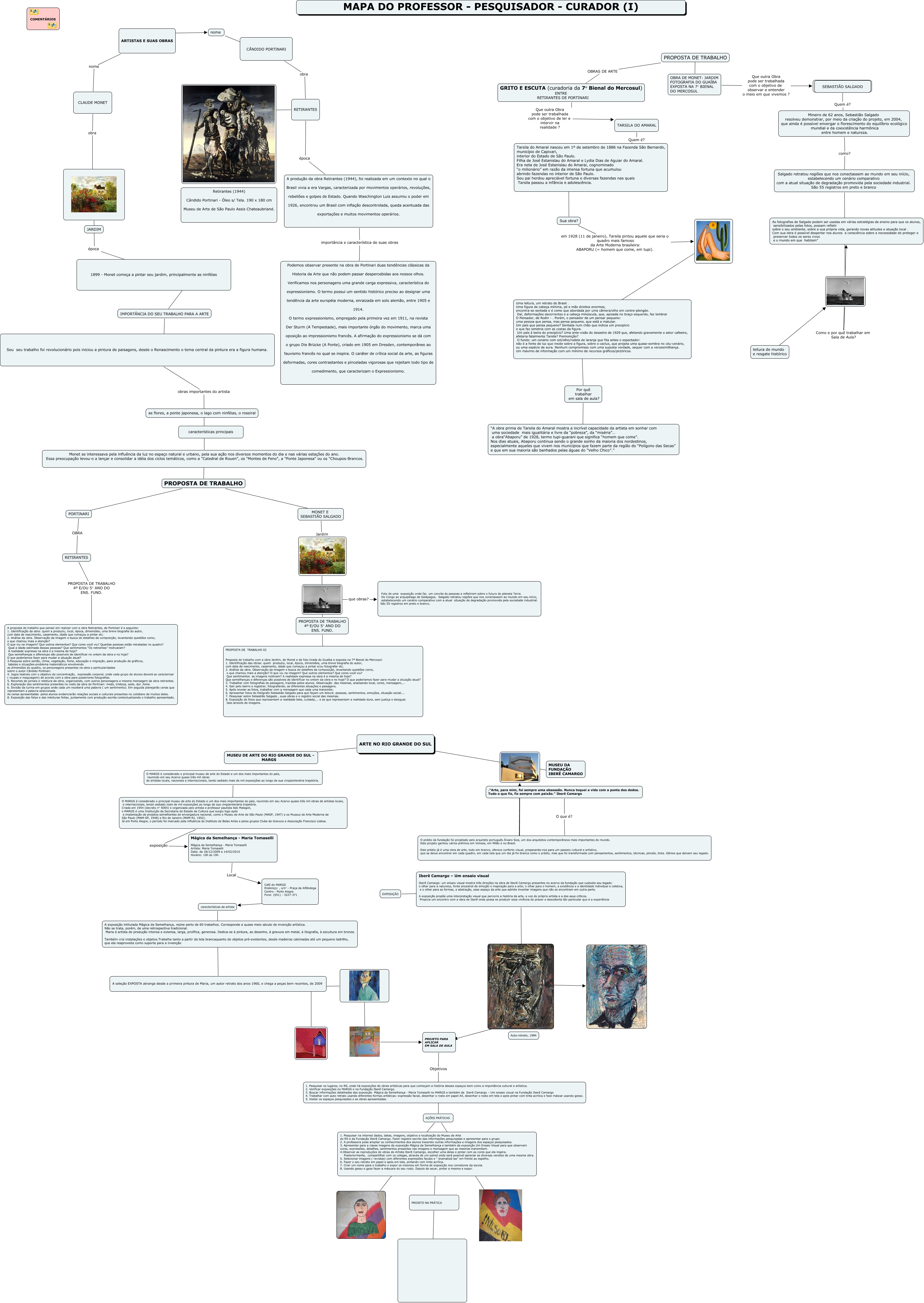 Esse mapa conceitual, produzido no IHMC CmapTools, tem a informação relacionada a: Mapa _ Profº-Pesquisador-Curador (I), IMPORTÂNCIA DO SEU TRABALHO PARA A ARTE ???? ????, características da artista ???? A seleção EXPOSTA abrange desde a primeira pintura de Maria, um autor retrato dos anos 1960, e chega a peças bem recentes, de 2009, 1. Pesquisar na internet dados, datas, imagens, objetivo e localização do Museu de Arte do RS e da Fundação Iberê Camargo. Fazer registro escrito das informações pesquisadas e apresentar para o grupo. 2. A professora pode ampliar os conhecimentos dos alunos trazendo outras informações e imagens dos espaços pesquisados. 3. Apresentar para a classe imagens da exposição Mágica da Semelhança e também da exposição Um Ensaio Visual para que observem cores, expressões, detalhes, sentimentos presentes nas imagens e mensagem que as mesmas transmitem. 4.Observar as reproduções de obras do Artista Iberê Camargo, escolher uma delas e pintar com as cores que ela inspira. Posteriormente, compartilhar com os colegas, através de um painel onde será possível apreciar as diversas versões de uma mesma obra. 5. Selecionar imagens ( revistas) com diferentes expressões faciais e " dramatizá-las" em frente ao espelho. 6. Fazer o seu retrato em papel e após em tela, pintando com tinta acrílica. 7. Criar um nome para o trabalho e expor os mesmos em forma de exposição nos corredores da escola. 8. Usando gesso e gaze fazer a máscara do seu rosto. Depois de secar, pintar a mesma e expor. ???? PROJETO NA PRÁTICA, AÇÕES PRÁTICAS, Seu seu trabalho foi revolucionário pois iniciou a pintura de paisagens, desde o Renascimento o tema central da pintura era a figura humana. obras importantes do artista Monet se interessava pela influência da luz no espaço natural e urbano, pela sua ação nos diversos momentos do dia e nas várias estações do ano. Essa preocupação levou-o a lançar e consolidar a idéia dos ciclos temáticos, como a "Catedral de Rouen", os "Montes de Feno", a "Ponte Japonesa" ou os "Choupos-Brancos., PORTINARI OBRA RETIRANTES, TARSILA DO AMARAL Quem é? Tarsila do Amaral nasceu em 1º de setembro de 1886 na Fazenda São Bernardo, município de Capivari, interior do Estado de São Paulo. Filha de José Estanislau do Amaral e Lydia Dias de Aguiar do Amaral. Era neta de José Estanislau do Amaral, cognominado “o milionário” em razão da imensa fortuna que acumulou abrindo fazendas no interior de São Paulo. Seu pai herdou apreciável fortuna e diversas fazendas nas quais Tarsila passou a infância e adolescência., PROJETO NA PRÁTICA ????, OBRA DE MONET: JARDIM FOTOGRAFIA DO GUAÍBA EXPOSTA NA 7° BIENAL DO MERCOSUL Que outra Obra pode ser trabalhada com o objetivo de observar e entender o meio em que vivemos ? SEBASTIÃO SALGADO, AÇÕES PRÁTICAS ???? 1. Pesquisar na internet dados, datas, imagens, objetivo e localização do Museu de Arte do RS e da Fundação Iberê Camargo. Fazer registro escrito das informações pesquisadas e apresentar para o grupo. 2. A professora pode ampliar os conhecimentos dos alunos trazendo outras informações e imagens dos espaços pesquisados. 3. Apresentar para a classe imagens da exposição Mágica da Semelhança e também da exposição Um Ensaio Visual para que observem cores, expressões, detalhes, sentimentos presentes nas imagens e mensagem que as mesmas transmitem. 4.Observar as reproduções de obras do Artista Iberê Camargo, escolher uma delas e pintar com as cores que ela inspira. Posteriormente, compartilhar com os colegas, através de um painel onde será possível apreciar as diversas versões de uma mesma obra. 5. Selecionar imagens ( revistas) com diferentes expressões faciais e " dramatizá-las" em frente ao espelho. 6. Fazer o seu retrato em papel e após em tela, pintando com tinta acrílica. 7. Criar um nome para o trabalho e expor os mesmos em forma de exposição nos corredores da escola. 8. Usando gesso e gaze fazer a máscara do seu rosto. Depois de secar, pintar a mesma e expor., AÇÕES PRÁTICAS ????, PROPOSTA DE TRABALHO 4º E/OU 5° ANO DO ENS. FUND. ???? PROPOSTA DE TRABALHO 02 Proposta de trabalho com a obra Jardim, de Monet e da foto tirada do Guaíba e exposta na 7º Bienal do Mercosul: 1. Identificação das obras: quem produziu, local, época, dimensões, uma breve biografia do autor, com data de nascimento, casamento, idade que começou a pintar e/ou fotografar etc. 2. Análise da obra. Observação da imagem e busca de detalhes da composição, levantando questões como, o que chamou mais a atenção? O que viu na imagem? Que outros elementos? Que cores você viu? Que sentimentos as imagens motivam? A realidade expressa na obra é a mesma de hoje? Que semelhanças e diferenças são possíveis de identificar no ontem da obra e no hoje? O que poderíamos fazer para mudar a situação atual? 3. Trabalhar com fotografias de paisagens, trazidas pelos alunos. Observação das mesmas, analisando local, cores, mensagem,... 4. Sair pelo bairro e registrar, fotografando, as diferentes situações e paisagens. 5. Após revelar as fotos, trabalhar com a mensagem que cada uma transmite; 6. Apresentar fotos do fotógrafo Sebastião Salgado para que façam um leitura: pessoas, sentimentos, emoções, situação social,... 7. Pesquisar sobre Sebastião Salgado , suas obras e o registro social das mesmas. 8. Exposição de fotos que representam a realidade bela, cuidada,... e as que representam a realidade dura, sem justiça e desigual. Isso através de imagens., Café do MARGS Endereço: , s/n° - Praça da Alfândega Centro - Porto Alegre Fone: (051) - 3227-371 ???? características da artista, CLAUDE MONET obra imagem, Tarsila do Amaral nasceu em 1º de setembro de 1886 na Fazenda São Bernardo, município de Capivari, interior do Estado de São Paulo. Filha de José Estanislau do Amaral e Lydia Dias de Aguiar do Amaral. Era neta de José Estanislau do Amaral, co