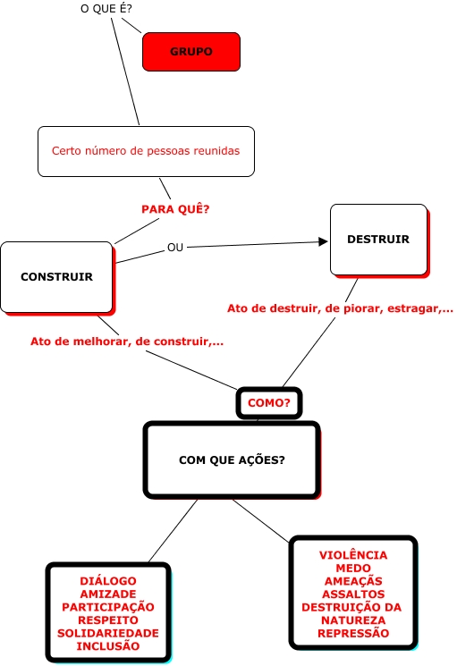 Esse mapa conceitual, produzido no IHMC CmapTools, tem a informação relacionada a: MAPA CONCEITUAL O QUE É UM GRUPO, COM QUE AÇÕES? ???? VIOLÊNCIA MEDO AMEAÇÃS ASSALTOS DESTRUIÇÃO DA NATUREZA REPRESSÃO, Certo número de pessoas reunidas PARA QUÊ? CONSTRUIR, COM QUE AÇÕES? ???? DI�?LOGO AMIZADE PARTICIPAÇÃO RESPEITO SOLIDARIEDADE INCLUSÃO, COMO? ???? DI�?LOGO AMIZADE PARTICIPAÇÃO RESPEITO SOLIDARIEDADE INCLUSÃO, DESTRUIR Ato de destruir, de piorar, estragar,... COMO?, Certo número de pessoas reunidas O QUE É? GRUPO, CONSTRUIR OU DESTRUIR, CONSTRUIR Ato de melhorar, de construir,... COMO?, COMO? ???? VIOLÊNCIA MEDO AMEAÇÃS ASSALTOS DESTRUIÇÃO DA NATUREZA REPRESSÃO