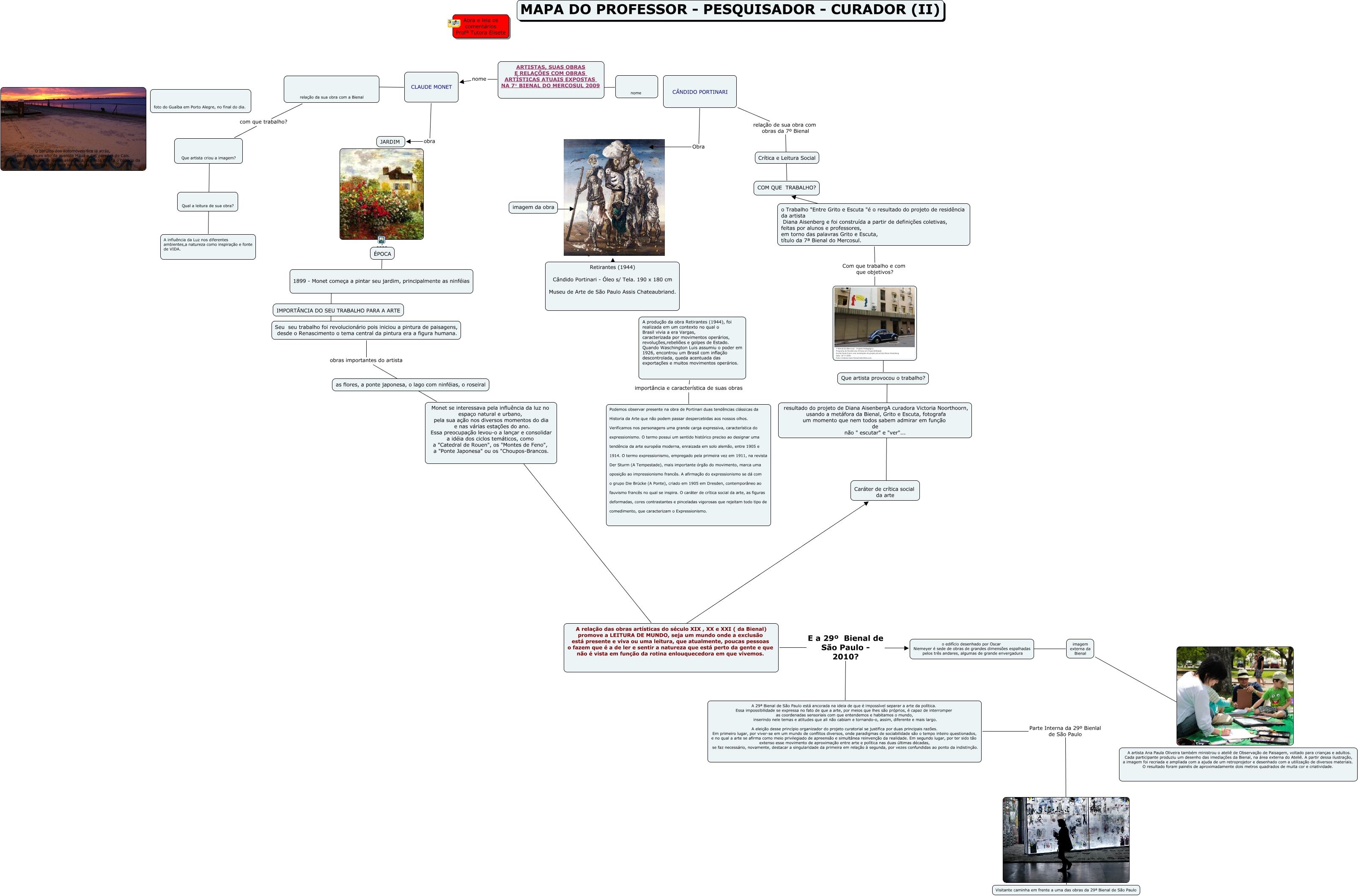 Esse mapa conceitual, produzido no IHMC CmapTools, tem a informação relacionada a: Mapa_Profº-Pesquisador-Curador (II), ???? Que artista provocou o trabalho?, A relação das obras artísticas do século XIX , XX e XXI ( da Bienal) promove a LEITURA DE MUNDO, seja um mundo onde a exclusão está presente e viva ou uma leitura, que atualmente, poucas pessoas o fazem que é a de ler e sentir a natureza que está perto da gente e que não é vista em função da rotina enlouquecedora em que vivemos. ???? Caráter de crítica social da arte, A produção da obra Retirantes (1944), foi realizada em um contexto no qual o Brasil vivia a era Vargas, caracterizada por movimentos operários, revoluções,rebeliões e golpes de Estado. Quando Waschington Luis assumiu o poder em 1926, encontrou um Brasil com inflação descontrolada, queda acentuada das exportações e muitos movimentos operários. importância e característica de suas obras Podemos observar presente na obra de Portinari duas tendências clássicas da Historia da Arte que não podem passar despercebidas aos nossos olhos. Verificamos nos personagens uma grande carga expressiva, característica do expressionismo. O termo possui um sentido histórico preciso ao designar uma tendência da arte européia moderna, enraizada em solo alemão, entre 1905 e 1914. O termo expressionismo, empregado pela primeira vez em 1911, na revista Der Sturm (A Tempestade), mais importante órgão do movimento, marca uma oposição ao impressionismo francês. A afirmação do expressionismo se dá com o grupo Die Brücke (A Ponte), criado em 1905 em Dresden, contemporâneo ao fauvismo francês no qual se inspira. O caráter de crítica social da arte, as figuras deformadas, cores contrastantes e pinceladas vigorosas que rejeitam todo tipo de comedimento, que caracterizam o Expressionismo., CLAUDE MONET obra JARDIM, JARDIM ???? 1899 - Monet começa a pintar seu jardim, principalmente as ninféias, Monet se interessava pela influência da luz no espaço natural e urbano, pela sua ação nos diversos momentos do dia e nas várias estações do ano. Essa preocupação levou-o a lançar e consolidar a idéia dos ciclos temáticos, como a "Catedral de Rouen", os "Montes de Feno", a "Ponte Japonesa" ou os "Choupos-Brancos. ???? A relação das obras artísticas do século XIX , XX e XXI ( da Bienal) promove a LEITURA DE MUNDO, seja um mundo onde a exclusão está presente e viva ou uma leitura, que atualmente, poucas pessoas o fazem que é a de ler e sentir a natureza que está perto da gente e que não é vista em função da rotina enlouquecedora em que vivemos., ARTISTAS, SUAS OBRAS E RELAÇÕES COM OBRAS ARTÍSTICAS ATUAIS EXPOSTAS NA 7° BIENAL DO MERCOSUL 2009 nome CLAUDE MONET, imagem da obra, Retirantes (1944) Cândido Portinari - Óleo s/ Tela. 190 x 180 cm Museu de Arte de São Paulo Assis Chateaubriand. ????, A 29ª Bienal de São Paulo está ancorada na ideia de que é impossível separar a arte da política. Essa impossibilidade se expressa no fato de que a arte, por meios que lhes são próprios, é capaz de interromper as coordenadas sensoriais com que entendemos e habitamos o mundo, inserindo nele temas e atitudes que ali não cabiam e tornando-o, assim, diferente e mais largo. A eleição desse princípio organizador do projeto curatorial se justifica por duas principais razões. Em primeiro lugar, por viver-se em um mundo de conflitos diversos, onde paradigmas de sociabilidade são o tempo inteiro questionados, e no qual a arte se afirma como meio privilegiado de apreensão e simultânea reinvenção da realidade. Em segundo lugar, por ter sido tão extenso esse movimento de aproximação entre arte e política nas duas últimas décadas, se faz necessário, novamente, destacar a singularidade da primeira em relação à segunda, por vezes confundidas ao ponto da indistinção. Parte Interna da 29º Bienlal de São Paulo Visitante caminha em frente a uma das obras da 29ª Bienal de São Paulo, o Trabalho "Entre Grito e Escuta "é o resultado do projeto de residência da artista Diana Aisenberg e foi construída a partir de definições coletivas, feitas por alunos e professores, em torno das palavras Grito e Escuta, título da 7ª Bienal do Mercosul. Com que trabalho e com que objetivos?, nome ???? ARTISTAS, SUAS OBRAS E RELAÇÕES COM OBRAS ARTÍSTICAS ATUAIS EXPOSTAS NA 7° BIENAL DO MERCOSUL 2009, A relação das obras artísticas do século XIX , XX e XXI ( da Bienal) promove a LEITURA DE MUNDO, seja um mundo onde a exclusão está presente e viva ou uma leitura, que atualmente, poucas pessoas o fazem que é a de ler e sentir a natureza que está perto da gente e que não é vista em função da rotina enlouquecedora em que vivemos. E a 29º Bienal de São Paulo - 2010? o edifício desenhado por Oscar Niemeyer é sede de obras de grandes dimensões espalhadas pelos três andares, algumas de grande envergadura, CÂNDIDO PORTINARI relação de sua obra com obras da 7º Bienal COM QUE TRABALHO?, nome ???? ARTISTAS, SUAS OBRAS E RELAÇÕES COM OBRAS ARTÍSTICAS ATUAIS EXPOSTAS NA 7° BIENAL DO MERCOSUL 2009, o Trabalho "Entre Grito e Escuta "é o resultado do projeto de residência da artista Diana Aisenberg e foi construída a partir de definições coletivas, feitas por alunos e professores, em torno das palavras Grito e Escuta, título da 7ª Bienal do Mercosul. ???? COM QUE TRABALHO?, Que artista provocou o trabalho? ???? Caráter da arte, 1899 - Monet começa a pintar seu jardim, principalmente as ninféias ???? ????, imagem externa da Bienal ???? o edifício desenhado por Oscar Niemeyer é sede de obras de grandes dimensões espalhadas pelos três andares, algumas de grande envergadura, relação da sua obra com a Bienal com que trabalho? Que artista criou a imagem?