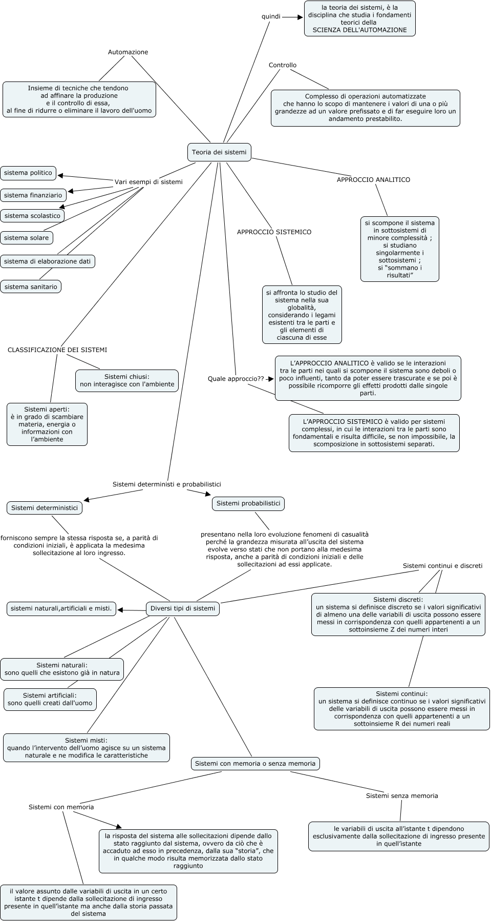 Questa Cmap, creata con IHMC CmapTools, contiene informazioni relative a: Teoria dei sistemi, Teoria dei sistemi APPROCCIO ANALITICO si scompone il sistema in sottosistemi di minore complessità ; si studiano singolarmente i sottosistemi ; si “sommano i risultati”, Diversi tipi di sistemi ???? Sistemi naturali: sono quelli che esistono già in natura, Teoria dei sistemi Vari esempi di sistemi sistema scolastico, Teoria dei sistemi Quale approccio?? L’APPROCCIO SISTEMICO è valido per sistemi complessi, in cui le interazioni tra le parti sono fondamentali e risulta difficile, se non impossibile, la scomposizione in sottosistemi separati., Teoria dei sistemi CLASSIFICAZIONE DEI SISTEMI Sistemi aperti: è in grado di scambiare materia, energia o informazioni con l’ambiente, Teoria dei sistemi Vari esempi di sistemi sistema sanitario, Teoria dei sistemi Automazione Insieme di tecniche che tendono ad affinare la produzione e il controllo di essa, al fine di ridurre o eliminare il lavoro dell'uomo, Teoria dei sistemi Sistemi deterministi e probabilistici Sistemi probabilistici, Sistemi con memoria o senza memoria Sistemi con memoria la risposta del sistema alle sollecitazioni dipende dallo stato raggiunto dal sistema, ovvero da ciò che è accaduto ad esso in precedenza, dalla sua “storia”, che in qualche modo risulta memorizzata dallo stato raggiunto, Teoria dei sistemi CLASSIFICAZIONE DEI SISTEMI Sistemi chiusi: non interagisce con l'ambiente, Teoria dei sistemi Controllo Complesso di operazioni automatizzate che hanno lo scopo di mantenere i valori di una o più grandezze ad un valore prefissato e di far eseguire loro un andamento prestabilito., Teoria dei sistemi APPROCCIO SISTEMICO si affronta lo studio del sistema nella sua globalità, considerando i legami esistenti tra le parti e gli elementi di ciascuna di esse, Sistemi con memoria o senza memoria Sistemi senza memoria le variabili di uscita all’istante t dipendono esclusivamente dalla sollecitazione di ingresso presente in quell’istante, Sistemi probabilistici presentano nella loro evoluzione fenomeni di casualità perché la grandezza misurata all’uscita del sistema evolve verso stati che non portano alla medesima risposta, anche a parità di condizioni iniziali e delle sollecitazioni ad essi applicate. Diversi tipi di sistemi, Diversi tipi di sistemi Sistemi continui e discreti Sistemi discreti: un sistema si definisce discreto se i valori significativi di almeno una delle variabili di uscita possono essere messi in corrispondenza con quelli appartenenti a un sottoinsieme Z dei numeri interi, Diversi tipi di sistemi ???? sistemi naturali,artificiali e misti., Diversi tipi di sistemi Sistemi continui e discreti Sistemi continui: un sistema si definisce continuo se i valori significativi delle variabili di uscita possono essere messi in corrispondenza con quelli appartenenti a un sottoinsieme R dei numeri reali, Sistemi deterministici forniscono sempre la stessa risposta se, a parità di condizioni iniziali, è applicata la medesima sollecitazione al loro ingresso. Diversi tipi di sistemi, Sistemi con memoria o senza memoria Sistemi con memoria il valore assunto dalle variabili di uscita in un certo istante t dipende dalla sollecitazione di ingresso presente in quell’istante ma anche dalla storia passata del sistema, Teoria dei sistemi Vari esempi di sistemi sistema politico