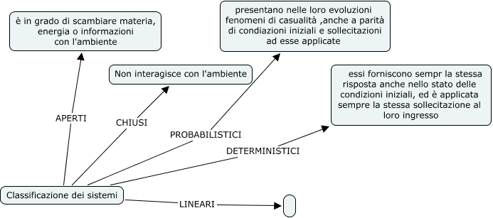 Questa Cmap, creata con IHMC CmapTools, contiene informazioni relative a: Classificazione di un sistema, Classificazione dei sistemi LINEARI, Classificazione dei sistemi DETERMINISTICI essi forniscono sempr la stessa risposta anche nello stato delle condizioni iniziali, ed è applicata sempre la stessa sollecitazione al loro ingresso, Classificazione dei sistemi PROBABILISTICI presentano nelle loro evoluzioni fenomeni di casualità ,anche a parità di condiazioni iniziali e sollecitazioni ad esse applicate, Classificazione dei sistemi APERTI è in grado di scambiare materia, energia o informazioni con l'ambiente, Classificazione dei sistemi CHIUSI Non interagisce con l'ambiente