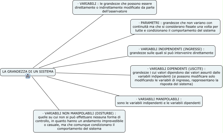Questa Cmap, creata con IHMC CmapTools, contiene informazioni relative a: LA GRANDEZZA DI UN SISTEMA, LA GRANDEZZA DI UN SISTEMA ???? · VARIABILI INDIPENDENTI (INGRESSI) : grandezze sulle quali si può intervenire direttamente, LA GRANDEZZA DI UN SISTEMA ???? · VARIABILI NON MANIPOLABILI (DISTURBI) : quelle su cui non si può effettuare nessuna forma di controllo, in quanto hanno un andamento imprevedibile o casuale, ma che comunque condizionano il comportamento del sistema, LA GRANDEZZA DI UN SISTEMA ???? · VARIABILI DIPENDENTI (USCITE) : grandezze i cui valori dipendono dai valori assunti dalle variabili indipendenti (si possono modificare solo modificando le variabili di ingresso, rappresentano la risposta del sistema), LA GRANDEZZA DI UN SISTEMA ???? · VARIABILI : le grandezze che possono essere direttamente o indirettamente modificate da parte dell’osservatore, LA GRANDEZZA DI UN SISTEMA ???? · VARIABILI MANIPOLABILI : sono le variabili indipendenti e le variabili dipendenti, LA GRANDEZZA DI UN SISTEMA ???? · PARAMETRI : grandezze che non variano con continuità ma che si considerano fissate una volta per tutte e condizionano il comportamento del sistema