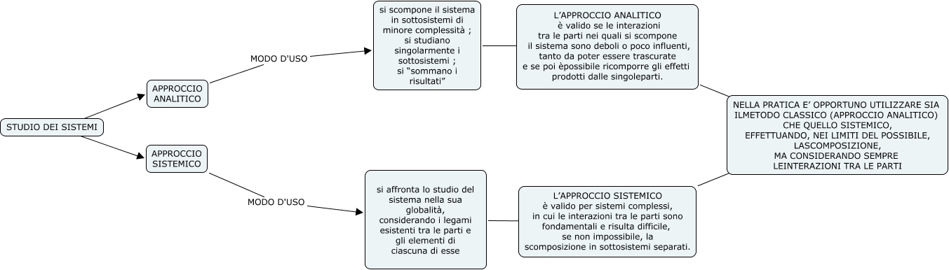 Questa Cmap, creata con IHMC CmapTools, contiene informazioni relative a: STUDIO DEI SISTEMI, si scompone il sistema in sottosistemi di minore complessità ; si studiano singolarmente i sottosistemi ; si “sommano i risultati” ???? L’APPROCCIO ANALITICO è valido se le interazioni tra le parti nei quali si scompone il sistema sono deboli o poco influenti, tanto da poter essere trascurate e se poi èpossibile ricomporre gli effetti prodotti dalle singoleparti., STUDIO DEI SISTEMI ???? APPROCCIO SISTEMICO, STUDIO DEI SISTEMI ???? APPROCCIO ANALITICO, APPROCCIO ANALITICO MODO D'USO si scompone il sistema in sottosistemi di minore complessità ; si studiano singolarmente i sottosistemi ; si “sommano i risultati”, L’APPROCCIO ANALITICO è valido se le interazioni tra le parti nei quali si scompone il sistema sono deboli o poco influenti, tanto da poter essere trascurate e se poi èpossibile ricomporre gli effetti prodotti dalle singoleparti. ???? NELLA PRATICA E’ OPPORTUNO UTILIZZARE SIA ILMETODO CLASSICO (APPROCCIO ANALITICO) CHE QUELLO SISTEMICO, EFFETTUANDO, NEI LIMITI DEL POSSIBILE, LASCOMPOSIZIONE, MA CONSIDERANDO SEMPRE LEINTERAZIONI TRA LE PARTI, L’APPROCCIO SISTEMICO è valido per sistemi complessi, in cui le interazioni tra le parti sono fondamentali e risulta difficile, se non impossibile, la scomposizione in sottosistemi separati. ???? NELLA PRATICA E’ OPPORTUNO UTILIZZARE SIA ILMETODO CLASSICO (APPROCCIO ANALITICO) CHE QUELLO SISTEMICO, EFFETTUANDO, NEI LIMITI DEL POSSIBILE, LASCOMPOSIZIONE, MA CONSIDERANDO SEMPRE LEINTERAZIONI TRA LE PARTI, APPROCCIO SISTEMICO MODO D'USO si affronta lo studio del sistema nella sua globalità, considerando i legami esistenti tra le parti e gli elementi di ciascuna di esse, si affronta lo studio del sistema nella sua globalità, considerando i legami esistenti tra le parti e gli elementi di ciascuna di esse ???? L’APPROCCIO SISTEMICO è valido per sistemi complessi, in cui le interazioni tra le parti sono fondamentali e risulta difficile, se non impossibile, la scomposizione in sottosistemi separati.