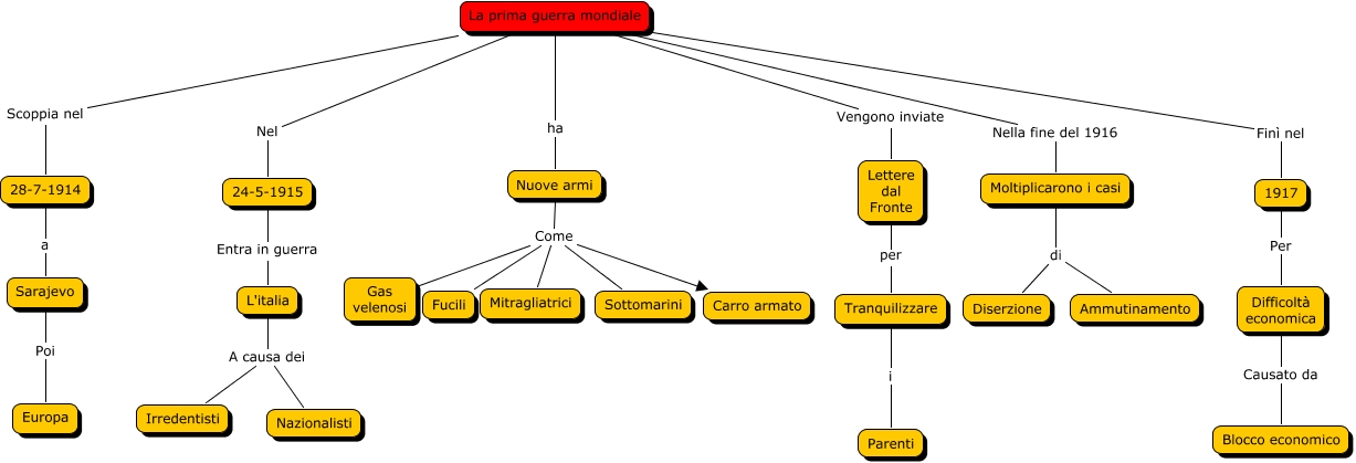 Questa Cmap, creata con IHMC CmapTools, contiene informazioni relative a: La prima guerra mondiale, Nuove armi Come Gas velenosi, La prima guerra mondiale Nella fine del 1916 Moltiplicarono i casi, La prima guerra mondiale Finì nel 1917, Tranquilizzare i Parenti, Lettere dal Fronte per Tranquilizzare, Moltiplicarono i casi di Ammutinamento, La prima guerra mondiale Scoppia nel 28-7-1914, La prima guerra mondiale ha Nuove armi, L'italia A causa dei Irredentisti, Moltiplicarono i casi di Diserzione, Nuove armi Come Carro armato, 24-5-1915 Entra in guerra L'italia, 1917 Per Difficoltà economica, Difficoltà economica Causato da Blocco economico, Nuove armi Come Sottomarini, L'italia A causa dei Nazionalisti, Nuove armi Come Fucili, La prima guerra mondiale Nel 24-5-1915, Sarajevo Poi Europa, 28-7-1914 a Sarajevo