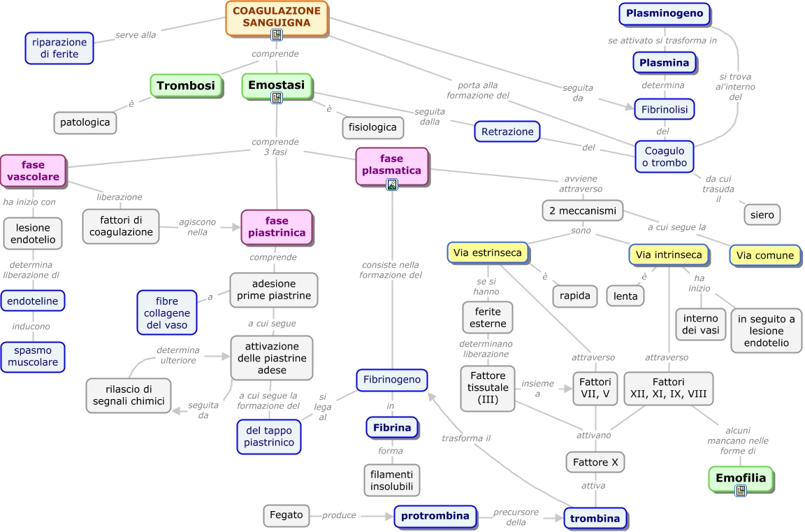 Questa Cmap, creata con IHMC CmapTools, contiene informazioni relative a: Emostasi, fase vascolare liberazione fattori di coagulazione, Via estrinseca se si hanno ferite esterne, Via estrinseca è rapida, Fattore tissutale (III) insieme a Fattori VII, V, Emostasi comprende 3 fasi fase vascolare, protrombina precursore della trombina, adesione prime piastrine a cui segue attivazione delle piastrine adese, fase plasmatica avviene attraverso 2 meccanismi, COAGULAZIONE SANGUIGNA seguita da Fibrinolisi, Via estrinseca attraverso Fattori VII, V, Plasminogeno si trova al'interno del Coagulo o trombo, Retrazione del Coagulo o trombo, Via intrinseca ha inizio in seguito a lesione endotelio, Fattori XII, XI, IX, VIII attivano Fattore X, COAGULAZIONE SANGUIGNA porta alla formazione del Coagulo o trombo, Fibrinogeno in Fibrina, fase vascolare ha inizio con lesione endotelio, fattori di coagulazione agiscono nella fase piastrinica, Via intrinseca è lenta, Plasmina determina Fibrinolisi