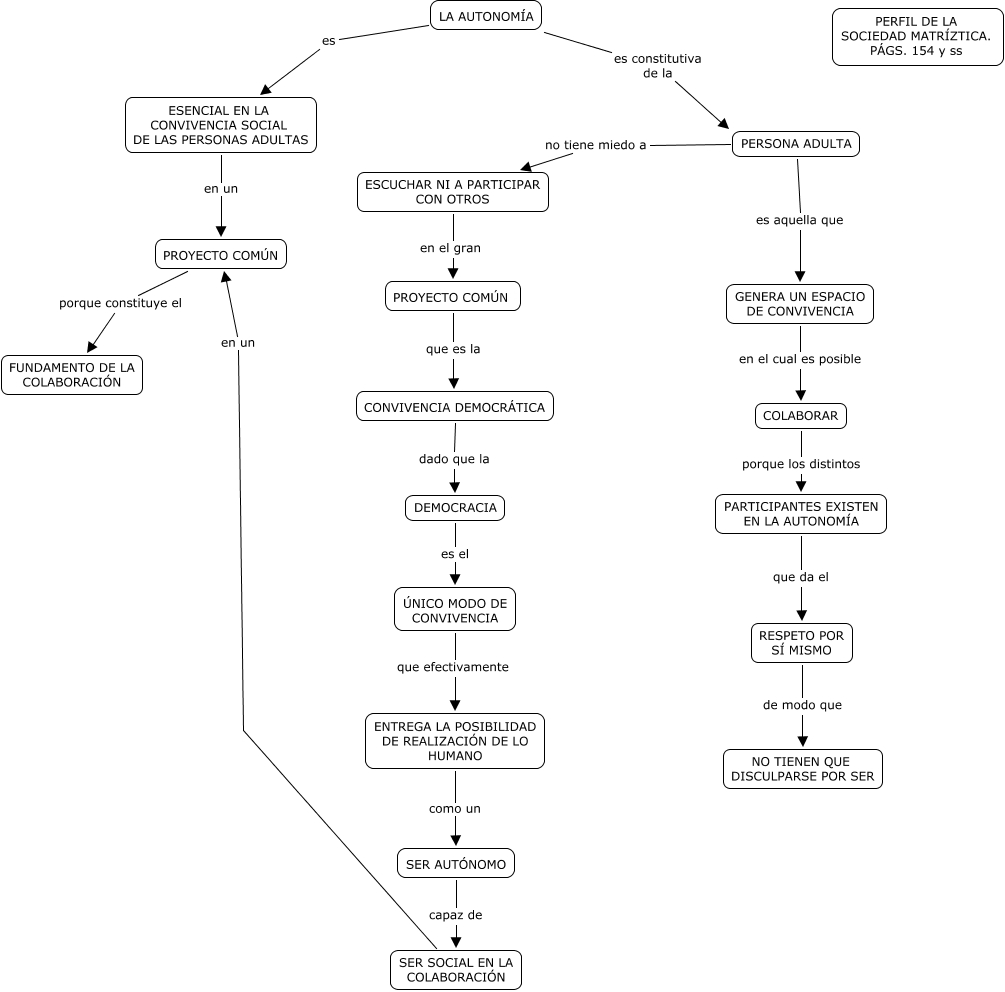 Este Cmap, tiene información relacionada con: AUTONOMÍA, PROYECTO COMÚN porque constituye el FUNDAMENTO DE LA COLABORACIÓN, LA AUTONOMÍA es constitutiva de la PERSONA ADULTA, PERSONA ADULTA no tiene miedo a ESCUCHAR NI A PARTICIPAR CON OTROS, ÚNICO MODO DE CONVIVENCIA que efectivamente ENTREGA LA POSIBILIDAD DE REALIZACIÓN DE LO HUMANO, RESPETO POR SÍ MISMO de modo que NO TIENEN QUE DISCULPARSE POR SER, LA AUTONOMÍA es ESENCIAL EN LA CONVIVENCIA SOCIAL DE LAS PERSONAS ADULTAS, CONVIVENCIA DEMOCRÁTICA dado que la DEMOCRACIA, PARTICIPANTES EXISTEN EN LA AUTONOMÍA que da el RESPETO POR SÍ MISMO, ESCUCHAR NI A PARTICIPAR CON OTROS en el gran PROYECTO COMÚN, SER SOCIAL EN LA COLABORACIÓN en un PROYECTO COMÚN, PROYECTO COMÚN que es la CONVIVENCIA DEMOCRÁTICA, ESENCIAL EN LA CONVIVENCIA SOCIAL DE LAS PERSONAS ADULTAS en un PROYECTO COMÚN, PERSONA ADULTA es aquella que GENERA UN ESPACIO DE CONVIVENCIA, GENERA UN ESPACIO DE CONVIVENCIA en el cual es posible COLABORAR, COLABORAR porque los distintos PARTICIPANTES EXISTEN EN LA AUTONOMÍA, ENTREGA LA POSIBILIDAD DE REALIZACIÓN DE LO HUMANO como un SER AUTÓNOMO, DEMOCRACIA es el ÚNICO MODO DE CONVIVENCIA, SER AUTÓNOMO capaz de SER SOCIAL EN LA COLABORACIÓN