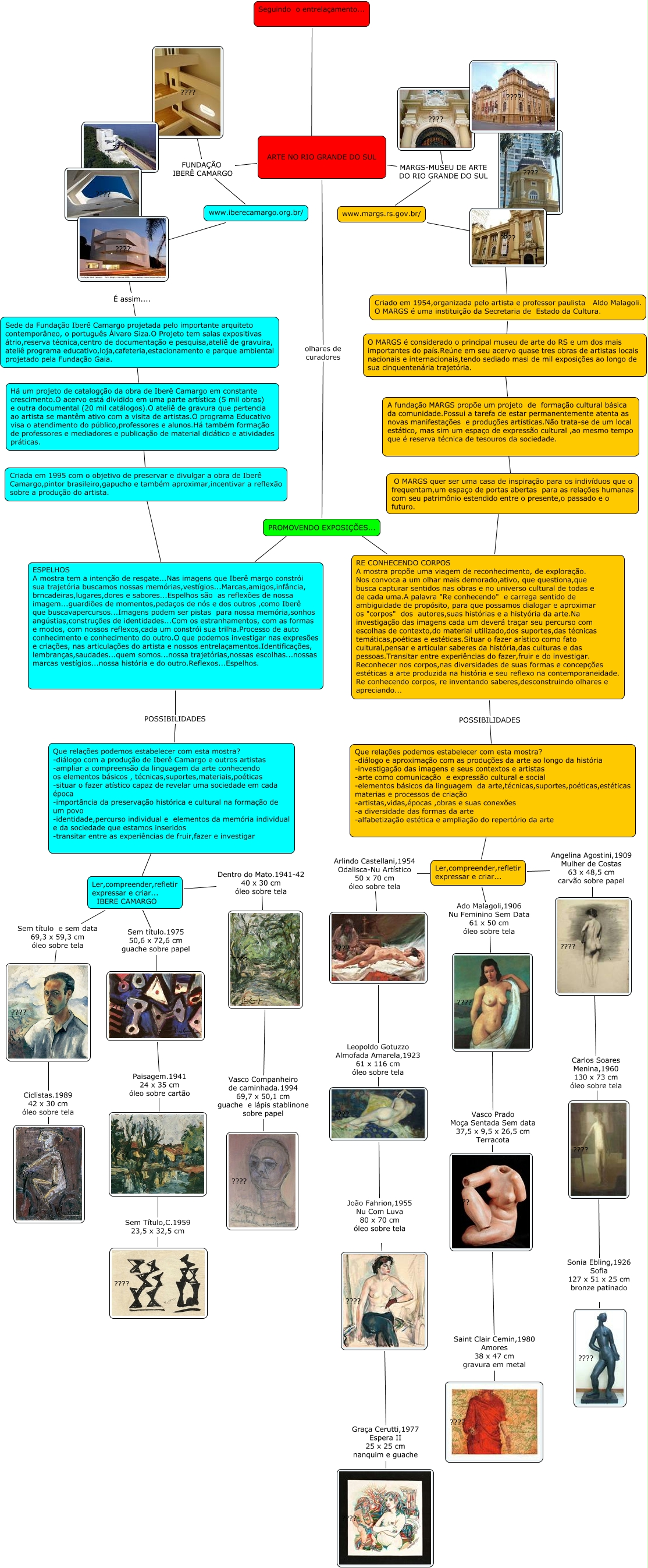 Esse mapa conceitual, produzido no IHMC CmapTools, tem a informação relacionada a: MAPA 3 ARTE NO RGS, Que relações podemos estabelecer com esta mostra? -diálogo e aproximação com as produções da arte ao longo da história -investigação das imagens e seus contextos e artistas -arte como comunicação e expressão cultural e social -elementos básicos da linguagem da arte,técnicas,suportes,poéticas,estéticas materias e processos de criação -artistas,vidas,épocas ,obras e suas conexões -a diversidade das formas da arte -alfabetização estética e ampliação do repertório da arte ???? Ler,compreender,refletir expressar e criar..., Ler,compreender,refletir expressar e criar... IBERE CAMARGO Dentro do Mato.1941-42 40 x 30 cm óleo sobre tela ????, ESPELHOS A mostra tem a intenção de resgate...Nas imagens que Iberê margo constrói sua trajetória buscamos nossas memórias,vestígios...Marcas,amigos,infância, brncadeiras,lugares,dores e sabores...Espelhos são as reflexões de nossa imagem...guardiões de momentos,pedaços de nós e dos outros ,como Iberê que buscavapercursos...Imagens podem ser pistas para nossa memória,sonhos angústias,construções de identidades...Com os estranhamentos, com as formas e modos, com nossos reflexos,cada um constrói sua trilha.Processo de auto conhecimento e conhecimento do outro.O que podemos investigar nas expresões e criações, nas articulações do artista e nossos entrelaçamentos.Identificações, lembranças,saudades...quem somos...nossa trajetórias,nossas escolhas...nossas marcas vestígios...nossa história e do outro.Reflexos...Espelhos. POSSIBILIDADES Que relações podemos estabelecer com esta mostra? -diálogo com a produção de Iberê Camargo e outros artistas -ampliar a compreensão da linguagem da arte conhecendo os elementos básicos , técnicas,suportes,materiais,poéticas -situar o fazer atístico capaz de revelar uma sociedade em cada época -importância da preservação histórica e cultural na formação de um povo -identidade,percurso individual e elementos da memória individual e da sociedade que estamos inseridos -transitar entre as experiências de fruir,fazer e investigar, Seguindo o entrelaçamento... ???? ARTE NO RIO GRANDE DO SUL, Ler,compreender,refletir expressar e criar... Angelina Agostini,1909 Mulher de Costas 63 x 48,5 cm carvão sobre papel ????, ???? João Fahrion,1955 Nu Com Luva 80 x 70 cm óleo sobre tela ????, A fundação MARGS propõe um projeto de formação cultural básica da comunidade.Possui a tarefa de estar permanentemente atenta as novas manifestações e produções artísticas.Não trata-se de um local estático, mas sim um espaço de expressão cultural ,ao mesmo tempo que é reserva técnica de tesouros da sociedade. ???? O MARGS quer ser uma casa de inspiração para os indivíduos que o frequentam,um espaço de portas abertas para as relações humanas com seu patrimônio estendido entre o presente,o passado e o futuro., ???? Carlos Soares Menina,1960 130 x 73 cm óleo sobre tela ????, Há um projeto de catalogção da obra de Iberê Camargo em constante crescimento.O acervo está dividido em uma parte artística (5 mil obras) e outra documental (20 mil catálogos).O ateliê de gravura que pertencia ao artista se mantêm ativo com a visita de artistas.O programa Educativo visa o atendimento do público,professores e alunos.Há também formação de professores e mediadores e publicação de material didático e atividades práticas. ???? Criada em 1995 com o objetivo de preservar e divulgar a obra de Iberê Camargo,pintor brasileiro,gapucho e também aproximar,incentivar a reflexão sobre a produção do artista., ???? Vasco Prado Moça Sentada Sem data 37,5 x 9,5 x 26,5 cm Terracota ????, Criada em 1995 com o objetivo de preservar e divulgar a obra de Iberê Camargo,pintor brasileiro,gapucho e também aproximar,incentivar a reflexão sobre a produção do artista. ???? ESPELHOS A mostra tem a intenção de resgate...Nas imagens que Iberê margo constrói sua trajetória buscamos nossas memórias,vestígios...Marcas,amigos,infância, brncadeiras,lugares,dores e sabores...Espelhos são as reflexões de nossa imagem...guardiões de momentos,pedaços de nós e dos outros ,como Iberê que buscavapercursos...Imagens podem ser pistas para nossa memória,sonhos angústias,construções de identidades...Com os estranhamentos, com as formas e modos, com nossos reflexos,cada um constrói sua trilha.Processo de auto conhecimento e conhecimento do outro.O que podemos investigar nas expresões e criações, nas articulações do artista e nossos entrelaçamentos.Identificações, lembranças,saudades...quem somos...nossa trajetórias,nossas escolhas...nossas marcas vestígios...nossa história e do outro.Reflexos...Espelhos., RE CONHECENDO CORPOS A mostra propõe uma viagem de reconhecimento, de exploração. Nos convoca a um olhar mais demorado,ativo, que questiona,que busca capturar sentidos nas obras e no universo cultural de todas e de cada uma.A palavra "Re conhecendo" e carrega sentido de ambiguidade de propósito, para que possamos dialogar e aproximar os "corpos" dos autores,suas histórias e a histyória da arte.Na investigação das imagens cada um deverá traçar seu percurso com escolhas de contexto,do material utilizado,dos suportes,das técnicas temáticas,poéticas e estéticas.Situar o fazer arístico como fato cultural,pensar e articular saberes da história,das culturas e das pessoas.Transitar entre experiências do fazer,fruir e do investigar. Reconhecer nos corpos,nas diversidades de suas formas e concepções estéticas a arte produzida na história e seu reflexo na contemporaneidade. Re conhecendo corpos, re inventando saberes,desconstruindo olhares e apreciando... POSSIBILIDADES Que relações podemos estabelecer com esta mostra? -diálogo e aproximação com as produções da arte ao longo da história -investigação das imagens e seus contextos e artistas -