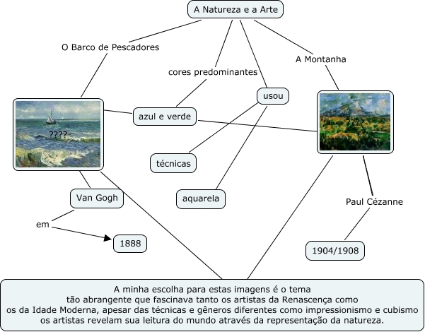 Esse mapa conceitual, produzido no IHMC CmapTools, tem a informação relacionada a: Paisagens, ???? Paul Cézanne 1904/1908, A Natureza e a Arte usou técnicas, ???? Paul Cézanne 1904/1908, A Natureza e a Arte A Montanha ????, azul e verde ???? ????, ???? ???? Van Gogh, A Natureza e a Arte cores predominantes azul e verde, ???? ???? A minha escolha para estas imagens é o tema tão abrangente que fascinava tanto os artistas da Renascença como os da Idade Moderna, apesar das técnicas e gêneros diferentes como impressionismo e cubismo os artistas revelam sua leitura do mundo através da representação da natureza., ???? ???? A minha escolha para estas imagens é o tema tão abrangente que fascinava tanto os artistas da Renascença como os da Idade Moderna, apesar das técnicas e gêneros diferentes como impressionismo e cubismo os artistas revelam sua leitura do mundo através da representação da natureza., azul e verde ???? ????, A Natureza e a Arte O Barco de Pescadores ????, Van Gogh em 1888, usou ???? aquarela