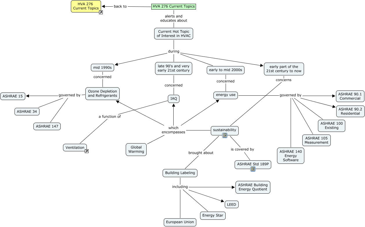 This Concept Map, created with IHMC CmapTools, has information related to: HVA276, sustainability which encompasses Ozone Depletion and Refrigerants, energy use governed by ASHRAE 140 Energy Software, early to mid 2000s concerned energy use, Building Labeling including Energy Star, energy use governed by ASHRAE 90.1 Commercial, HVA 276 Current Topics alerts and educates about Current Hot Topic of Interest in HVAC, Building Labeling including ASHRAE Building Energy Quotient, Current Hot Topic of Interest in HVAC during late 90's and very early 21st century, Current Hot Topic of Interest in HVAC during mid 1990s, sustainability which encompasses IAQ, early part of the 21st century to now concerns sustainability, sustainability which encompasses energy use, energy use governed by ASHRAE 90.2 Residential, energy use governed by ASHRAE 105 Measurement, sustainability is covered by ASHRAE Std 189P, HVA 276 Current Topics back to HVA 276 Current Topics, energy use governed by ASHRAE 100 Existing, Ozone Depletion and Refrigerants governed by ASHRAE 15, Current Hot Topic of Interest in HVAC during early part of the 21st century to now, mid 1990s concerned Ozone Depletion and Refrigerants