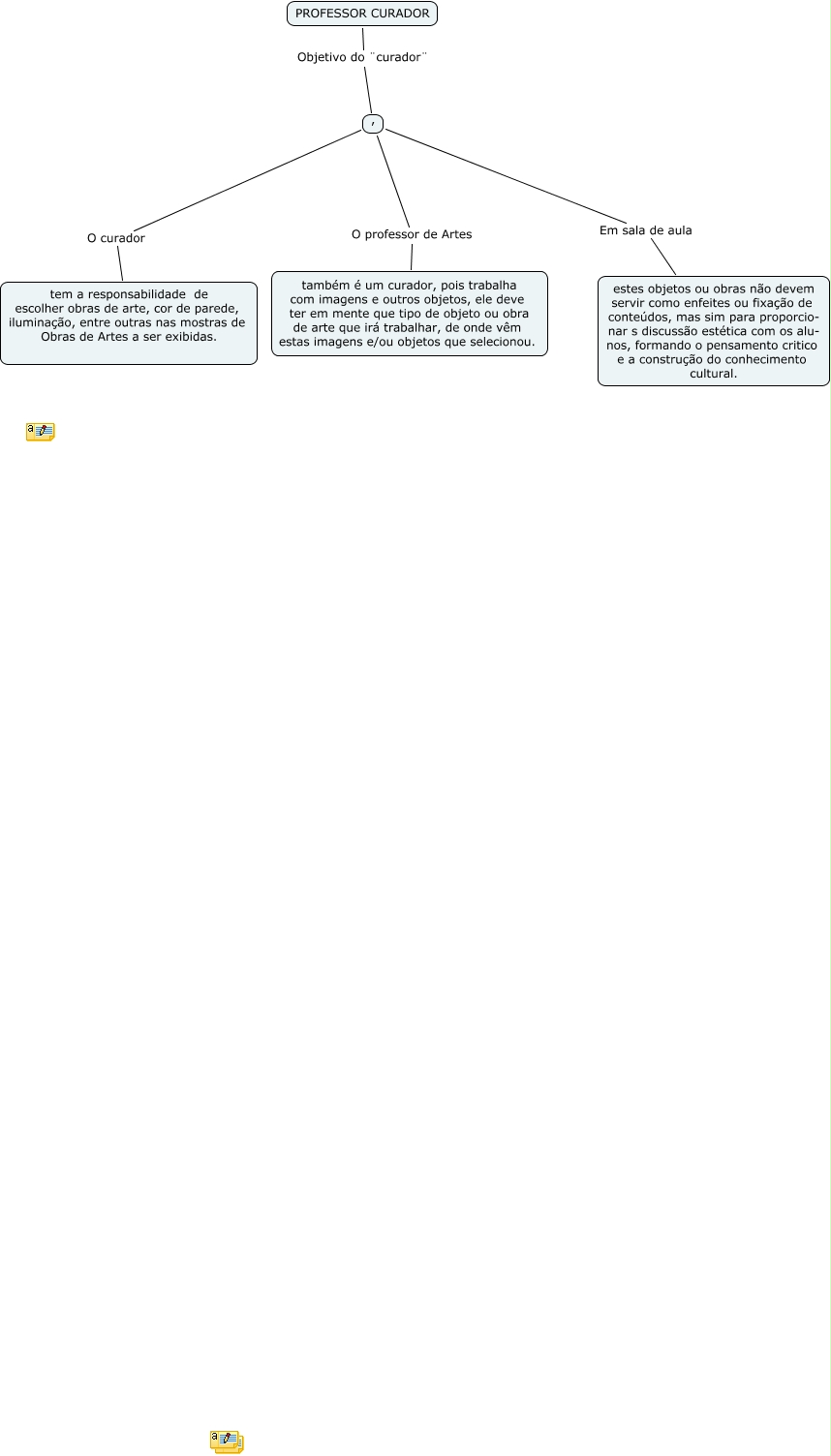 Esse mapa conceitual, produzido no IHMC CmapTools, tem a informação relacionada a: professor curador, , O professor de Artes também é um curador, pois trabalha com imagens e outros objetos, ele deve ter em mente que tipo de objeto ou obra de arte que irá trabalhar, de onde vêm estas imagens e/ou objetos que selecionou., , Em sala de aula estes objetos ou obras não devem servir como enfeites ou fixação de conteúdos, mas sim para proporcio- nar s discussão estética com os alu- nos, formando o pensamento critico e a construção do conhecimento cultural., , O curador tem a responsabilidade de escolher obras de arte, cor de parede, iluminação, entre outras nas mostras de Obras de Artes a ser exibidas., PROFESSOR CURADOR Objetivo do ¨curador¨ ,
