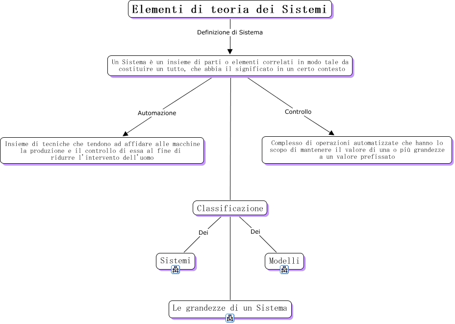 Questa Cmap, creata con IHMC CmapTools, contiene informazioni relative a: Teoria dei Sistemi, Un Sistema è un insieme di parti o elementi correlati in modo tale da costituire un tutto, che abbia il significato in un certo contesto Automazione Insieme di tecniche che tendono ad affidare alle macchine la produzione e il controllo di essa al fine di ridurre l'intervento dell'uomo, Classificazione Dei Modelli, Un Sistema è un insieme di parti o elementi correlati in modo tale da costituire un tutto, che abbia il significato in un certo contesto ???? Classificazione, Un Sistema è un insieme di parti o elementi correlati in modo tale da costituire un tutto, che abbia il significato in un certo contesto Controllo Complesso di operazioni automatizzate che hanno lo scopo di mantenere il valore di una o più grandezze a un valore prefissato, Elementi di teoria dei Sistemi Definizione di Sistema Un Sistema è un insieme di parti o elementi correlati in modo tale da costituire un tutto, che abbia il significato in un certo contesto, Classificazione Dei Sistemi, Classificazione ???? Le grandezze di un Sistema