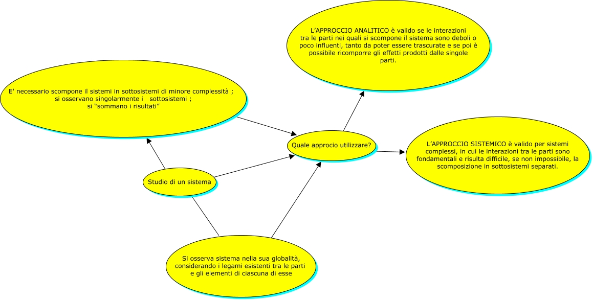 Questa Cmap, creata con IHMC CmapTools, contiene informazioni relative a: Studio di un sitema, Studio di un sistema ???? E' necessario scompone il sistemi in sottosistemi di minore complessità ; si osservano singolarmente i sottosistemi ; si “sommano i risultati”, Studio di un sistema ???? Quale approcio utilizzare?, Quale approcio utilizzare? ???? L’APPROCCIO ANALITICO è valido se le interazioni tra le parti nei quali si scompone il sistema sono deboli o poco influenti, tanto da poter essere trascurate e se poi è possibile ricomporre gli effetti prodotti dalle singole parti., E' necessario scompone il sistemi in sottosistemi di minore complessità ; si osservano singolarmente i sottosistemi ; si “sommano i risultati” ???? Quale approcio utilizzare?, Studio di un sistema ???? Si osserva sistema nella sua globalità, considerando i legami esistenti tra le parti e gli elementi di ciascuna di esse, Quale approcio utilizzare? ???? L’APPROCCIO SISTEMICO è valido per sistemi complessi, in cui le interazioni tra le parti sono fondamentali e risulta difficile, se non impossibile, la scomposizione in sottosistemi separati., Si osserva sistema nella sua globalità, considerando i legami esistenti tra le parti e gli elementi di ciascuna di esse ???? Quale approcio utilizzare?