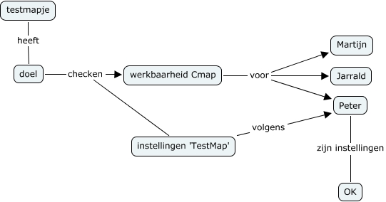 Deze Concept Map heeft informatie gerelateerd aan: testmap, Peter zijn instellingen OK, werkbaarheid Cmap voor Peter, testmapje heeft doel, doel checken werkbaarheid Cmap, instellingen 'TestMap' volgens Peter, werkbaarheid Cmap voor Martijn, werkbaarheid Cmap voor Jarrald, doel checken instellingen 'TestMap'