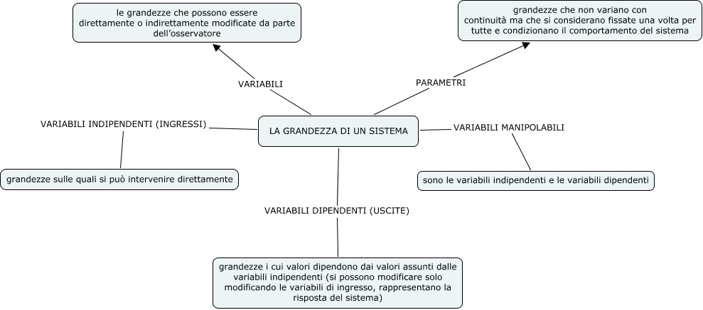 Questa Cmap, creata con IHMC CmapTools, contiene informazioni relative a: LA GRANDEZZA DI UN SISTEMA, LA GRANDEZZA DI UN SISTEMA VARIABILI le grandezze che possono essere direttamente o indirettamente modificate da parte dell’osservatore, LA GRANDEZZA DI UN SISTEMA VARIABILI MANIPOLABILI sono le variabili indipendenti e le variabili dipendenti, LA GRANDEZZA DI UN SISTEMA VARIABILI DIPENDENTI (USCITE) grandezze i cui valori dipendono dai valori assunti dalle variabili indipendenti (si possono modificare solo modificando le variabili di ingresso, rappresentano la risposta del sistema), LA GRANDEZZA DI UN SISTEMA PARAMETRI grandezze che non variano con continuità ma che si considerano fissate una volta per tutte e condizionano il comportamento del sistema, LA GRANDEZZA DI UN SISTEMA VARIABILI INDIPENDENTI (INGRESSI) grandezze sulle quali si può intervenire direttamente