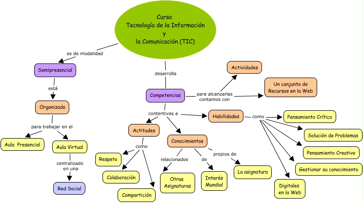 Este Cmap, tiene información relacionada con: Curso de TIC 2010, Curso Tecnología de la Información y la Comunicación (TIC) desarrolla Competencias, Conocimientos relacionados Otras Asignaturas, Actitudes como Respeto, Semipresencial está Organizado, Competencias contentivas a Conocimientos, Conocimientos propios de La asignatura, Aula Virtual centralizado en una Red Social, Competencias contentivas a Actitudes, Conocimientos de Interés Mundial, Curso Tecnología de la Información y la Comunicación (TIC) es de modalidad Semipresencial, Competencias para alcanzarlas contamos con Actividades, Actitudes como Compartición, Habilidades como Gestionar su conocimiento, Habilidades como Digitales en la Web, Habilidades como Pensamiento Creativo, Actitudes como Colaboración, Organizado para trabajar en el Aula Presencial, Organizado para trabajar en el Aula Virtual, Competencias para alcanzarlas contamos con Un conjunto de Recursos en la Web, Competencias contentivas a Habilidades