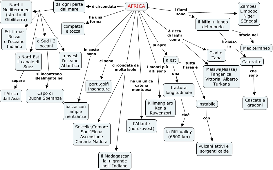 Questa Cmap, creata con IHMC CmapTools, contiene informazioni relative a: 1 AFRICA, AFRICA è ricca di laghi come Ciad e Tana, da ogni parte dal mare a Nord il Mediterraneo (stretto di Gibiliterra), AFRICA i fiumi sono il Nilo + lungo del mondo, AFRICA si apre a est, instabile con vulcani attivi e sorgenti calde, da ogni parte dal mare a Est il mar Rosso e l'oceano Indiano, a est tutta l'area è instabile, AFRICA ci sono porti,golfi insenature, AFRICA circondata da molte isole il Madagascar la + grande nell' Indiano, il Nilo + lungo del mondo sfocia nel Mediterraneo, frattura longitudinale cioè la Rift Valley (6500 km), Cateratte che sono Cascate a gradoni, AFRICA circondata da molte isole Seicelle,Comore Sant'Elena Ascensione Canarie Madera, a est una frattura longitudinale, AFRICA è ricca di laghi come Malawi(Niassa) Tanganica, Vittoria, Alberto Turkana, AFRICA ha una forma compatta e tozza, AFRICA le coste sono basse con ampie rientranze, AFRICA ha un unica catena montuosa l'Atlante (nord-ovest), AFRICA i fiumi sono Zambesi Limpopo Niger SEnegal, AFRICA è circondata da ogni parte dal mare