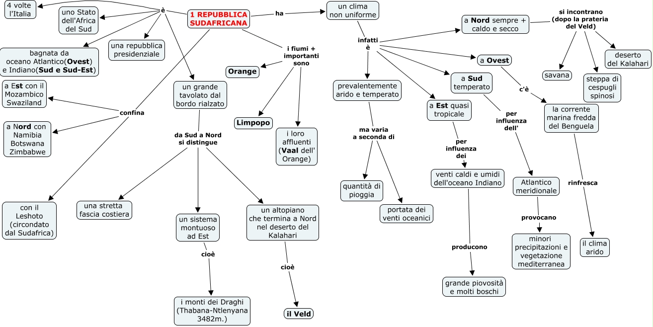 Questa Cmap, creata con IHMC CmapTools, contiene informazioni relative a: 1 REPUBBLICA SUDAFRICANA, a Ovest c'è la corrente marina fredda del Benguela, a Nord sempre + caldo e secco si incontrano (dopo la prateria del Veld) steppa di cespugli spinosi, 1 REPUBBLICA SUDAFRICANA i fiumi + importanti sono Limpopo, un grande tavolato dal bordo rialzato da Sud a Nord si distingue un sistema montuoso ad Est, un sistema montuoso ad Est cioè i monti dei Draghi (Thabana-Ntlenyana 3482m.), 1 REPUBBLICA SUDAFRICANA confina a Est con il Mozambico Swaziland, 1 REPUBBLICA SUDAFRICANA i fiumi + importanti sono Orange, a Est quasi tropicale per influenza dei venti caldi e umidi dell'oceano Indiano, un clima non uniforme infatti è prevalentemente arido e temperato, Atlantico meridionale provocano minori precipitazioni e vegetazione mediterranea, 1 REPUBBLICA SUDAFRICANA confina con il Leshoto (circondato dal Sudafrica), venti caldi e umidi dell'oceano Indiano producono grande piovosità e molti boschi, prevalentemente arido e temperato ma varia a seconda di portata dei venti oceanici, 1 REPUBBLICA SUDAFRICANA i fiumi + importanti sono i loro affluenti (Vaal dell' Orange), a Sud temperato per influenza dell' Atlantico meridionale, un clima non uniforme infatti è a Sud temperato, 1 REPUBBLICA SUDAFRICANA confina a Nord con Namibia Botswana Zimbabwe, un clima non uniforme infatti è a Est quasi tropicale, 1 REPUBBLICA SUDAFRICANA è un grande tavolato dal bordo rialzato, a Nord sempre + caldo e secco si incontrano (dopo la prateria del Veld) savana